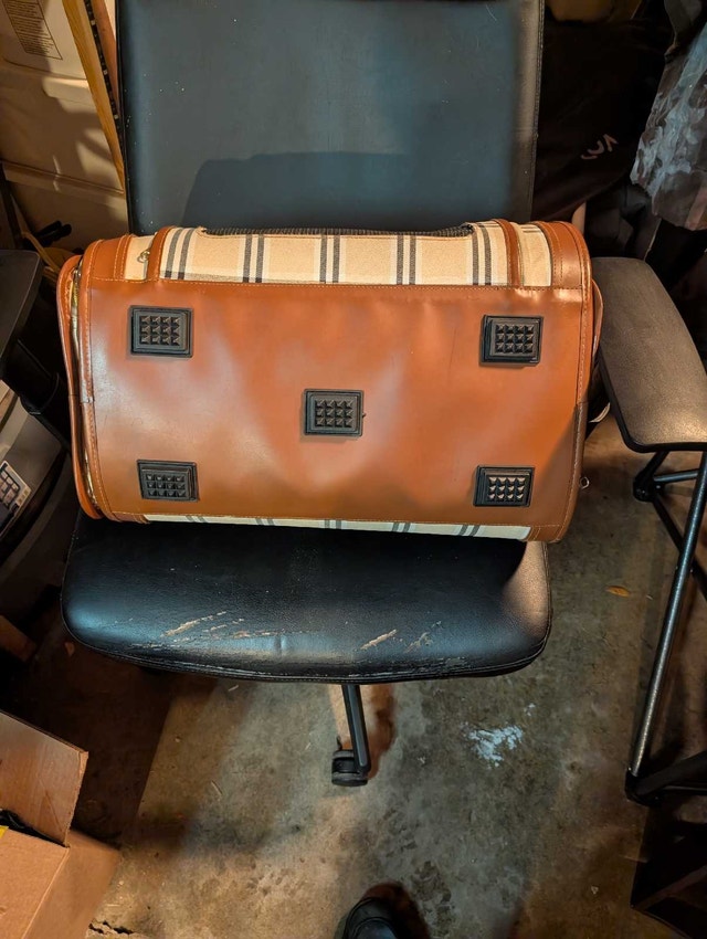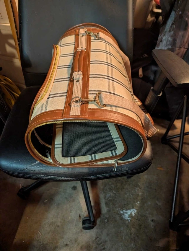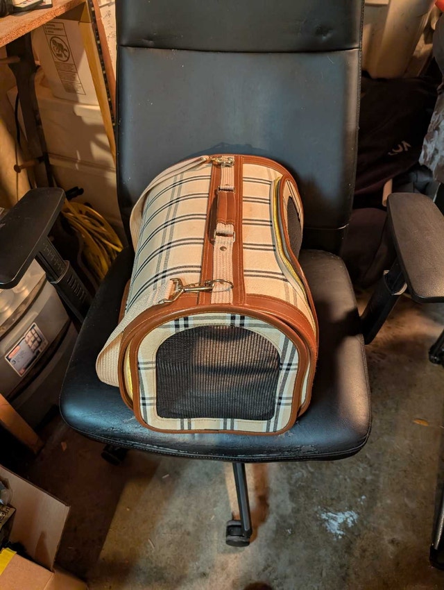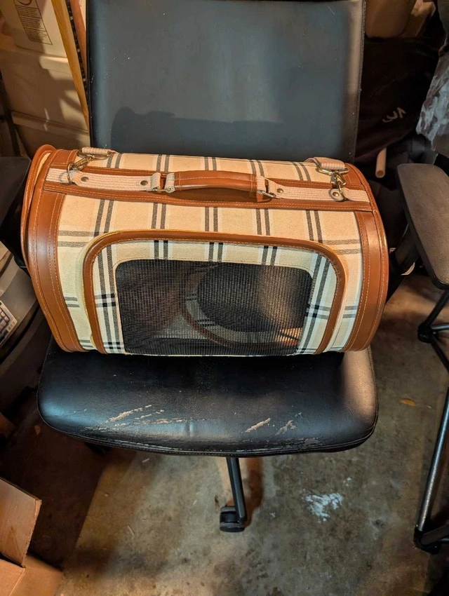 This stylish and sturdy pet carrier is perfect for safely transporting your furry friend. It's in great condition and features mesh windows for ventilation and a comfortable interior. Perfect for small dogs or cats!