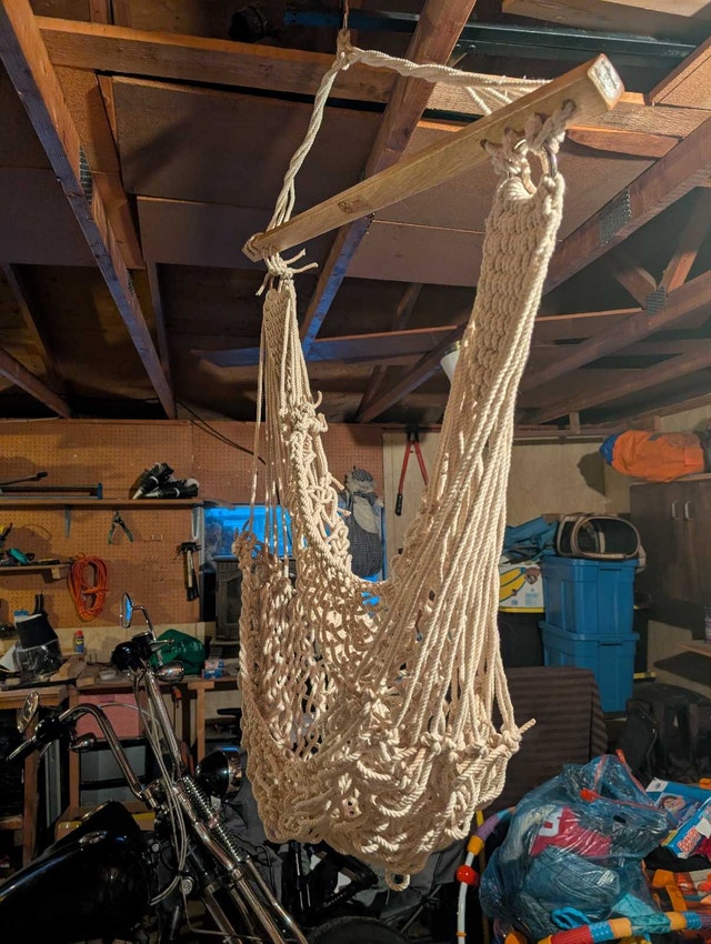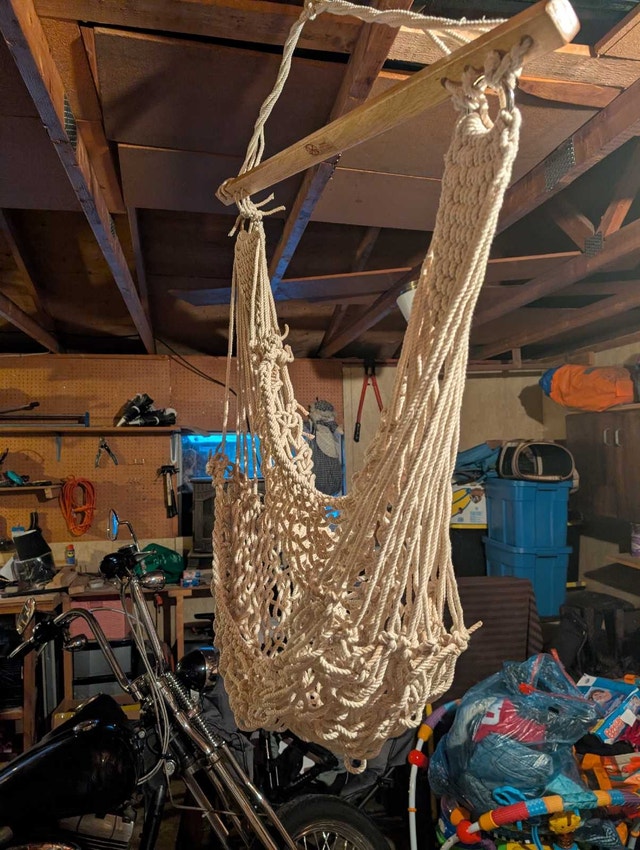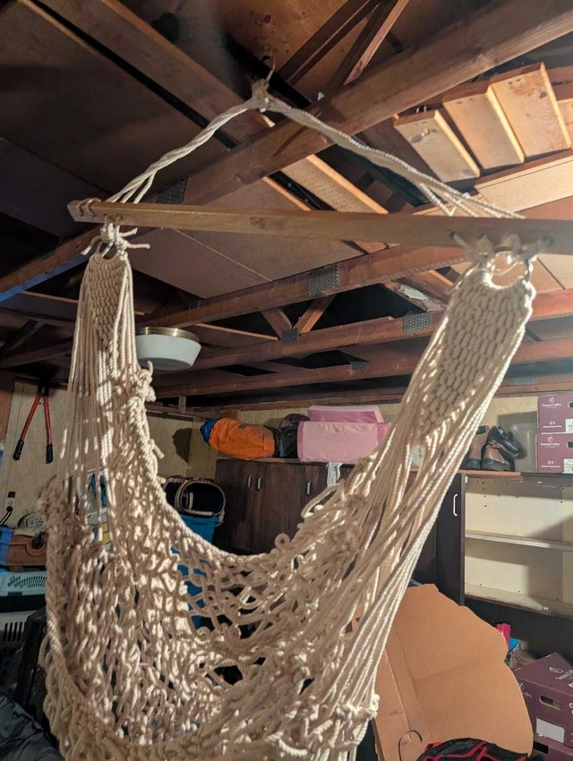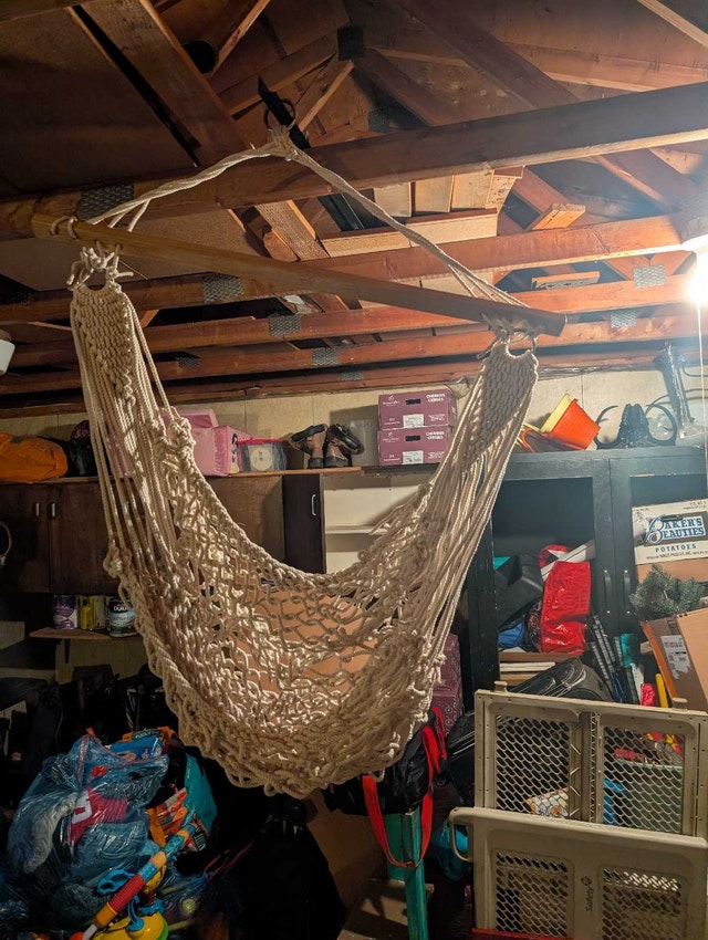 Relax in style with this gently used hammock chair! It's perfect for indoor or outdoor use, offering a comfy spot to unwind. I'm decluttering and ready to pass this relaxation station on to someone new. It's in good condition and ready for a new home. If the ad is up, the hammock chair is available – ready to swing into action and bring relaxation to its new owner!