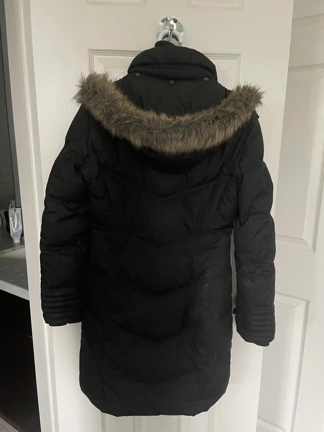 A stylish black winter coat from Esprit! It's in great condition and ready to keep you warm this winter. It features a faux fur-trimmed hood and a flattering, fitted silhouette. Porch pick up Yonge and 16th