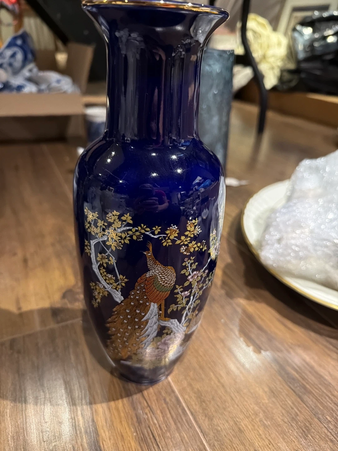 Selling this beautiful blue vase with a peacock with cherry blossom design! It would look lovely as a decorative piece in any room of your home