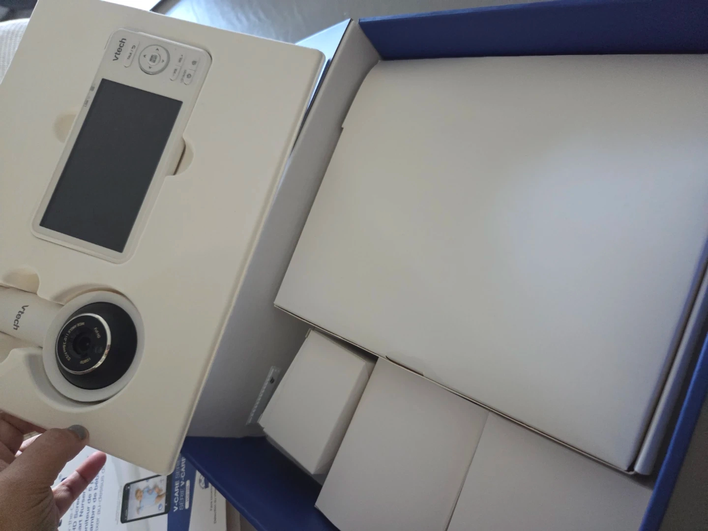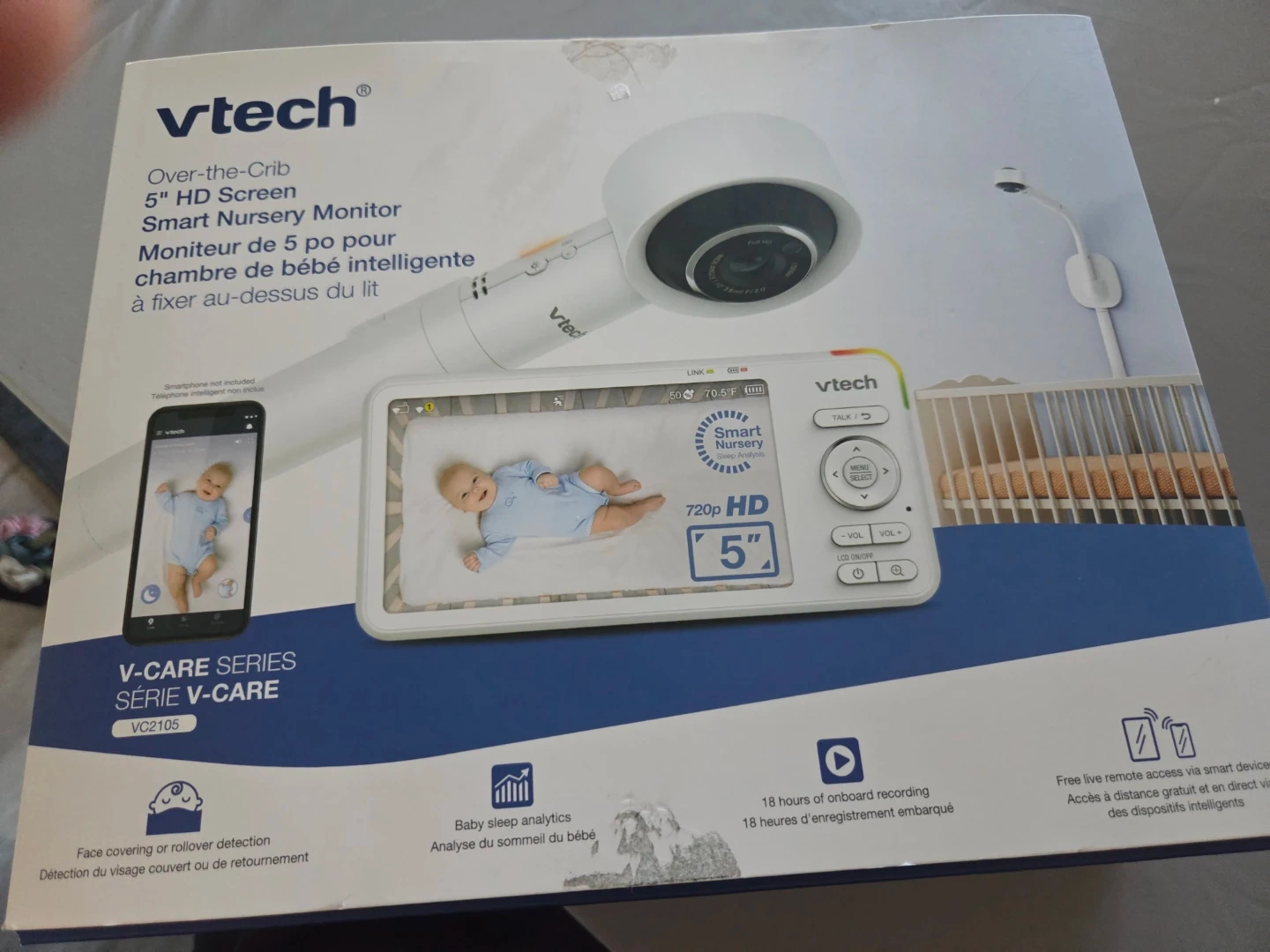 Selling a VTech V-Care Series VC2105 baby monitor with a 5" HD screen! It's an over-the-crib smart nursery monitor. It comes with the original box and all included components. Features include face covering and rollover detection, baby sleep analytics, and 18 hours of onboard recording