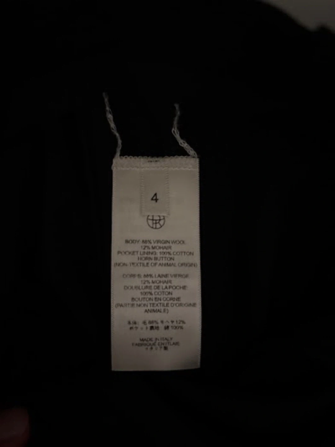 The tag shows the body is 86% virgin wool and 12% mohair. The pocket lining is 100% cotton. Core is 86% laine vierge and 12% mohair. The double is 100% cotton.
