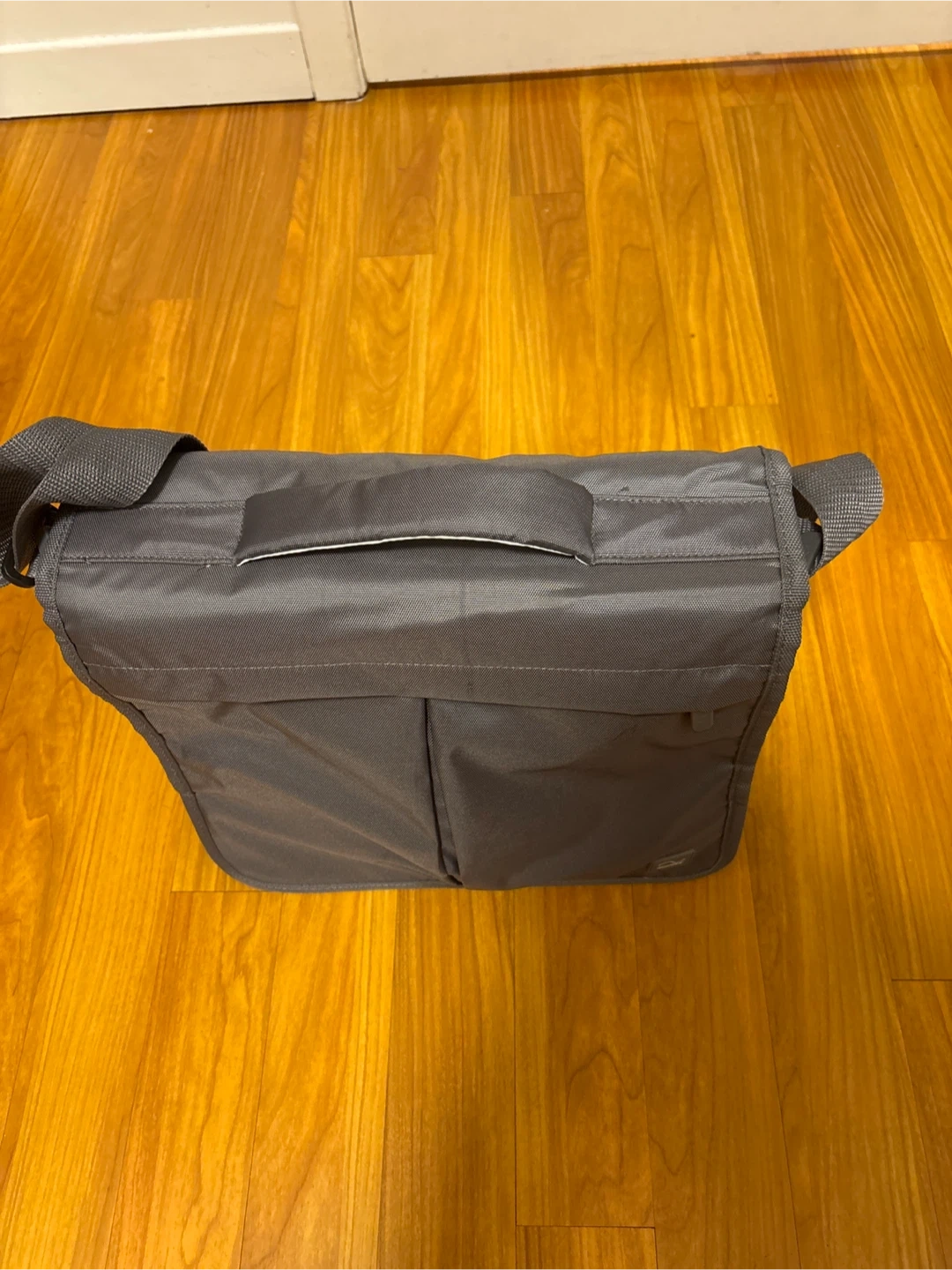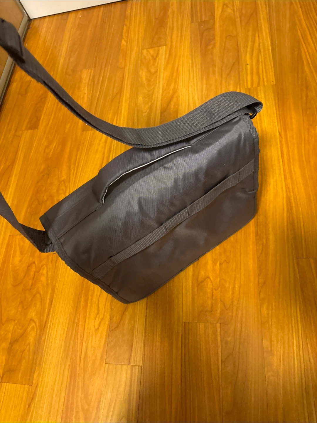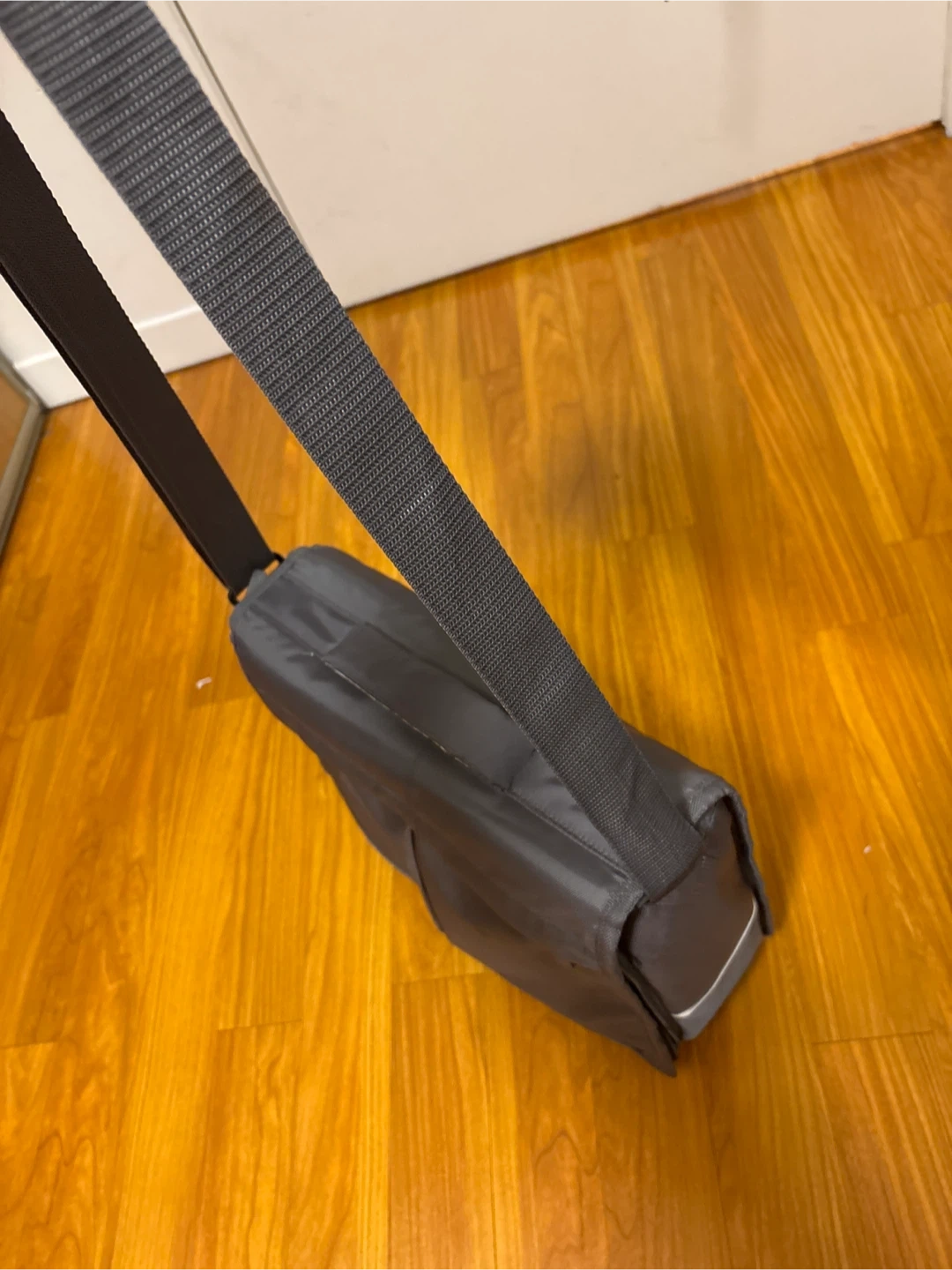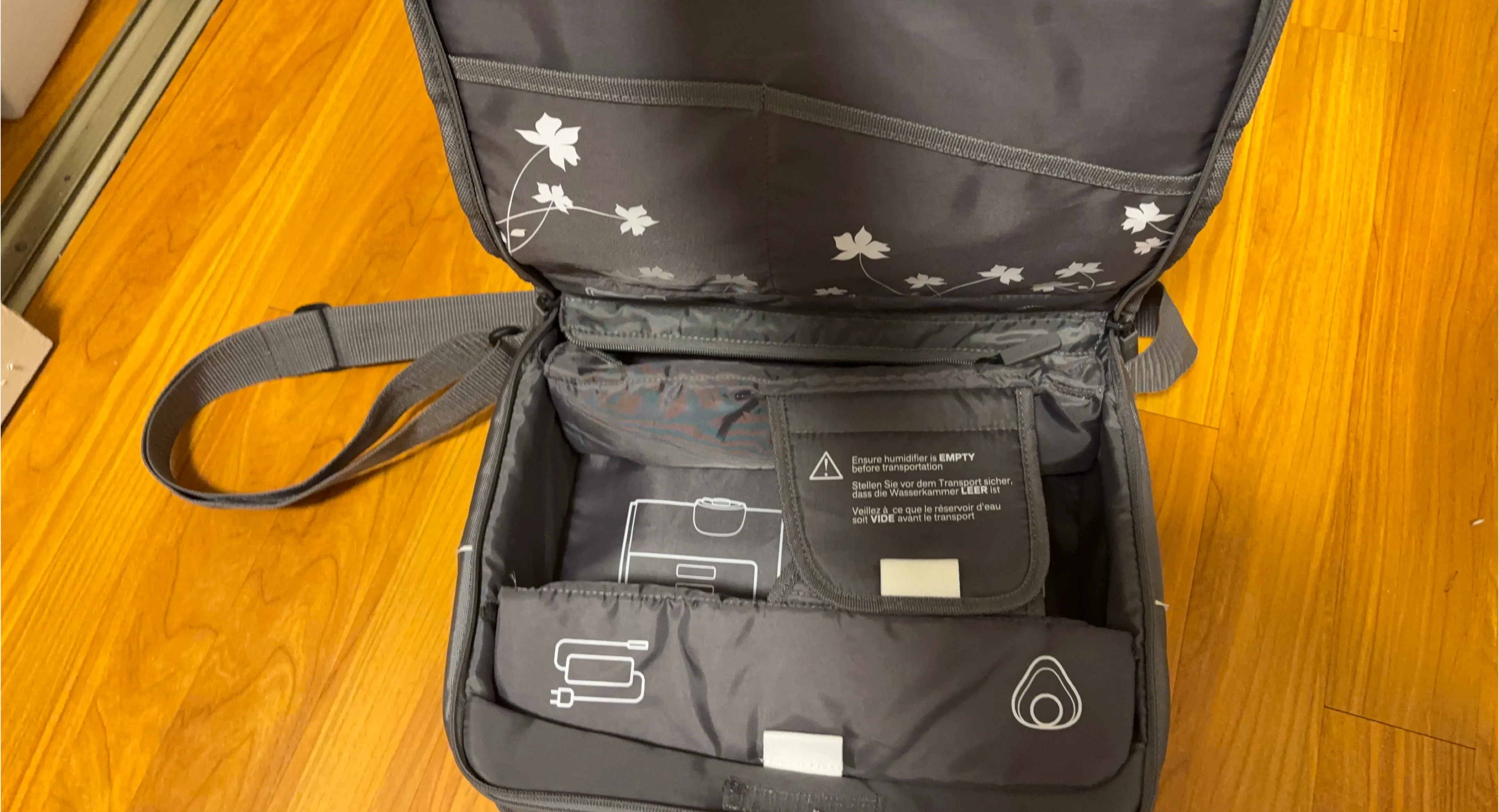 Here's a grey medical transport bag, perfect for carrying medical equipment and supplies! It has a shoulder strap and internal compartments to keep everything organized. The bag also has a warning to ensure the humidifier is empty before transportation.