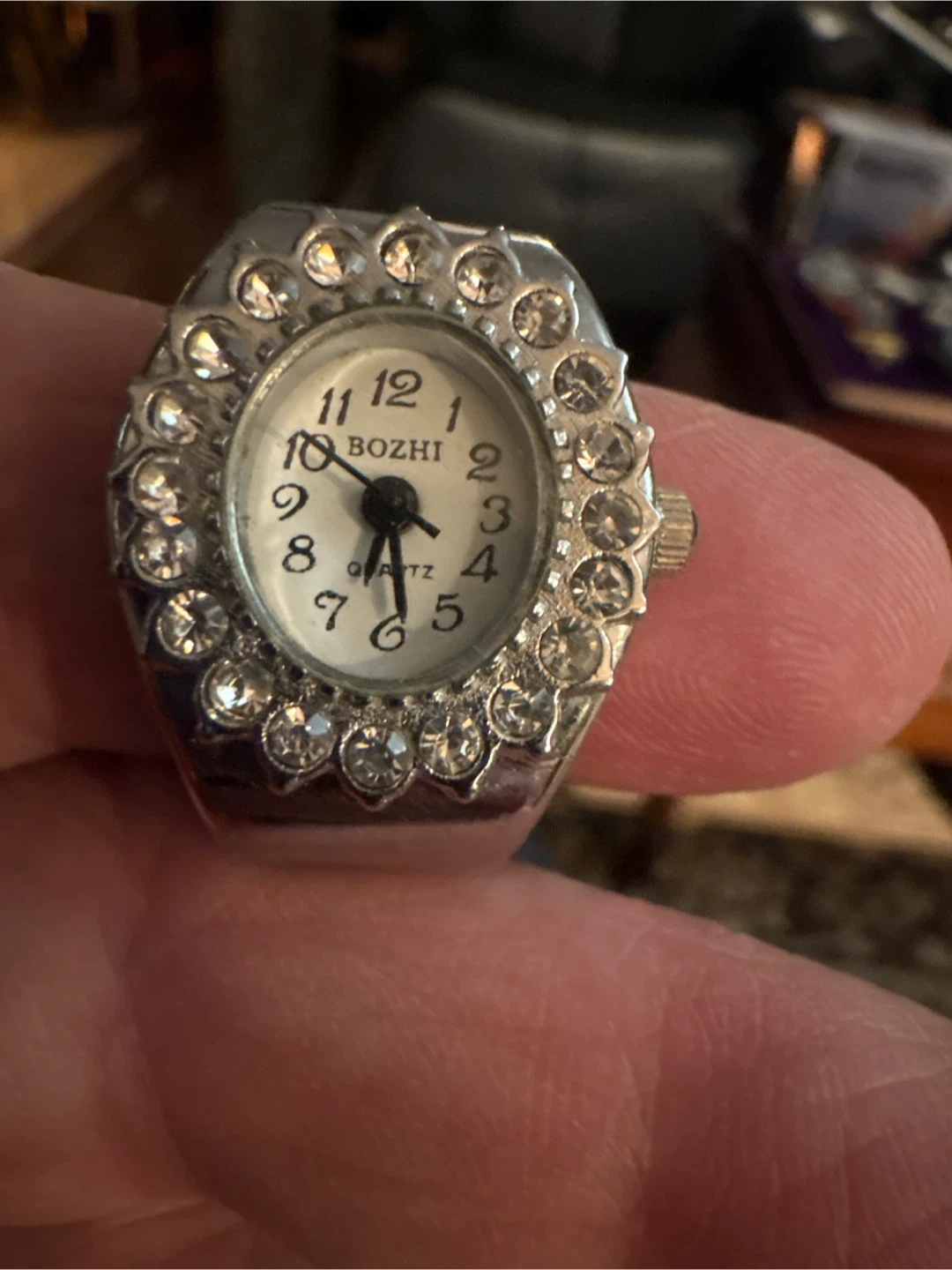Selling a Bozhi Quartz ring watch. It has a silver-tone band with a decorative design around the watch face. A unique accessory! Requires a battery