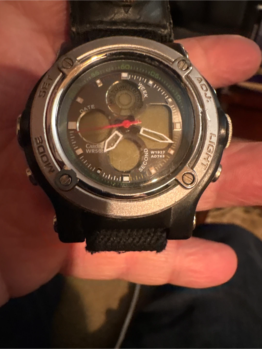 Selling a Cardin WR50 watch. It features a date and week display, and has a black band. It's in good condition and ready for a new wrist!