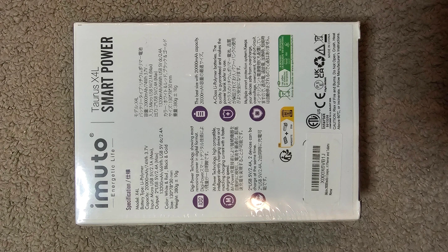 Selling a brand new Imuto Taurus X4L Smart Power Bank! It has a 20000mAh capacity and two USB 5V/2.4A ports, so you can charge two devices at the same time. It's compatible with Nintendo Switch, iPad, phones, and cameras. The box is included