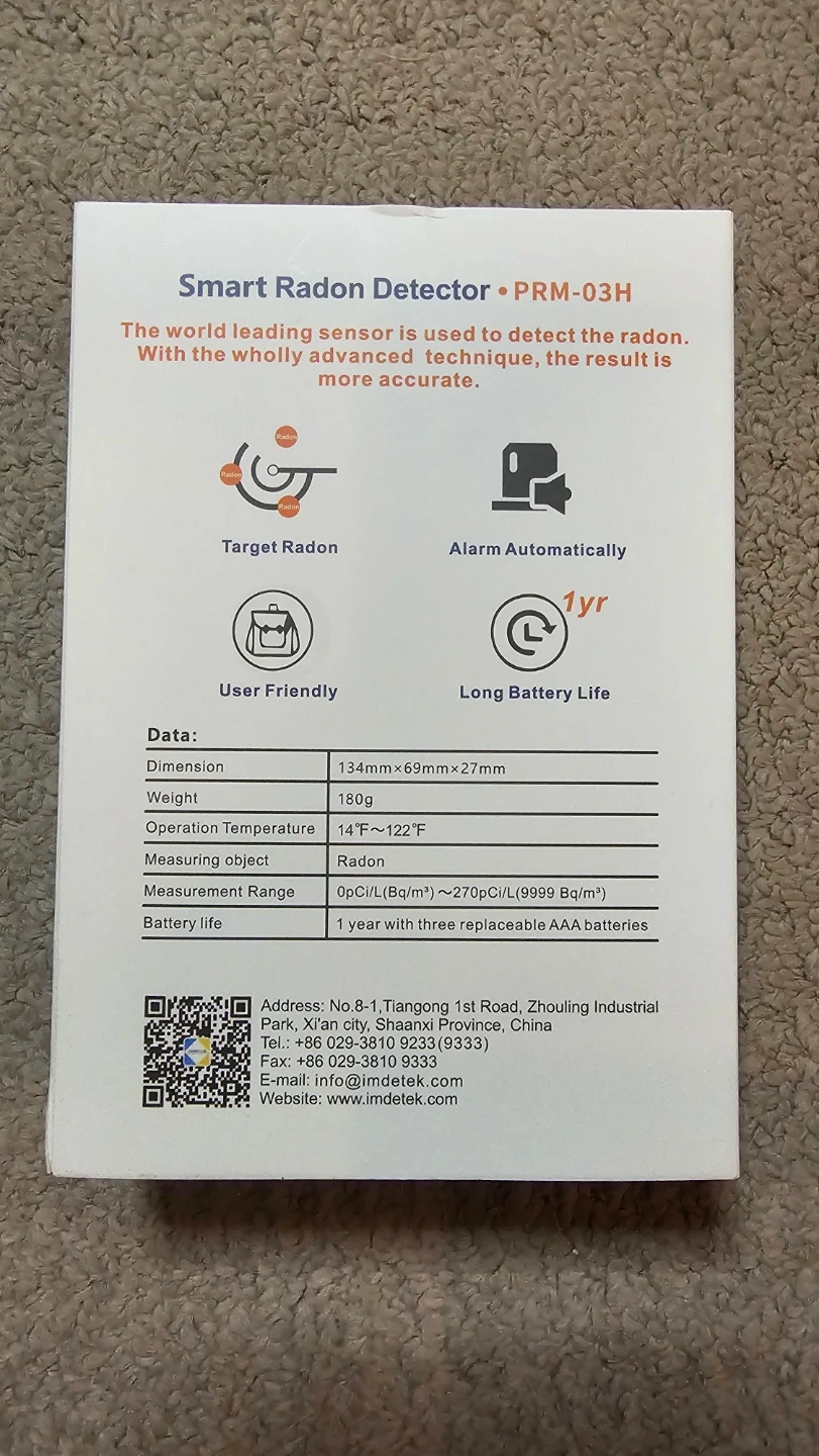 - Measurement Range: 0pCi/L (Bq/m³) ~ 270pCi/L (9999 Bq/m³)