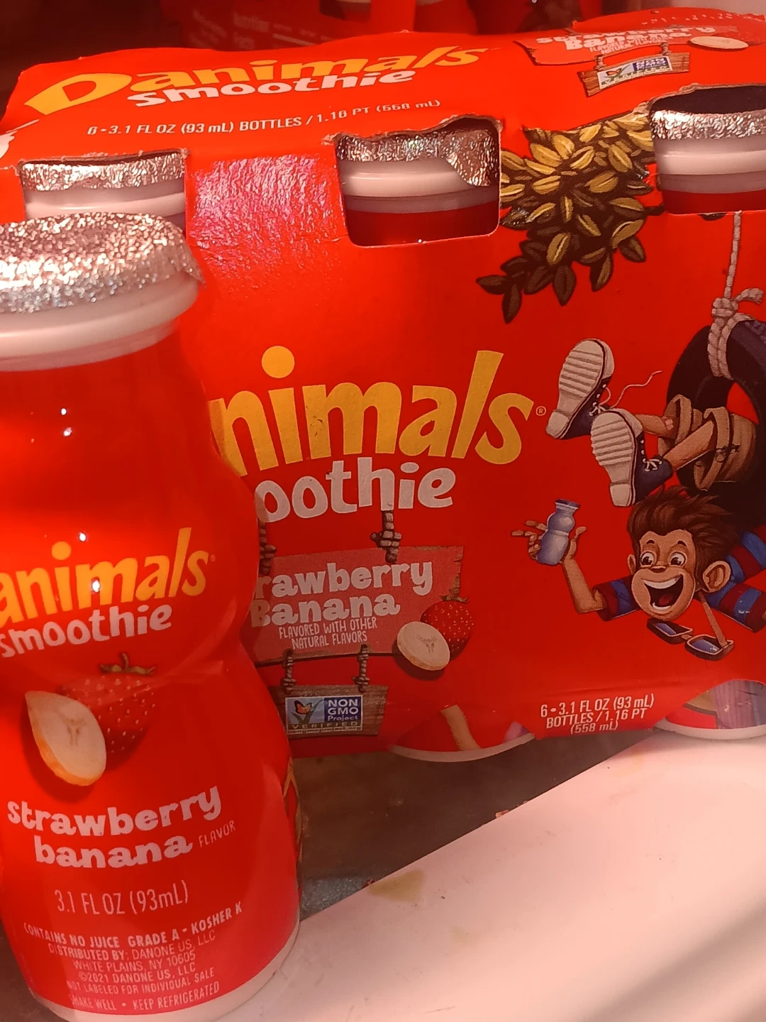 Selling a 6-pack of Danimals Strawberry Banana smoothies! Each bottle is 3.1 fl oz (93mL). Perfect for a quick and tasty snack. Contains no juice and is Grade A Kosher. Keep refrigerated! 3 packs of 6 small containers.