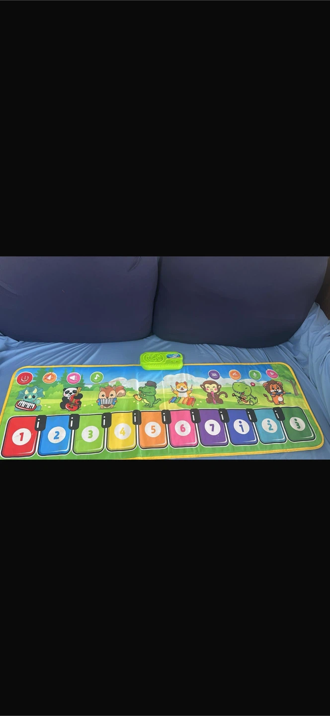 Selling a fun animal-themed piano mat for kids! It features colourful keys numbered 1 to 7, each with a different animal above it. It also includes a control panel at the top. Great for introducing little ones to music and sounds