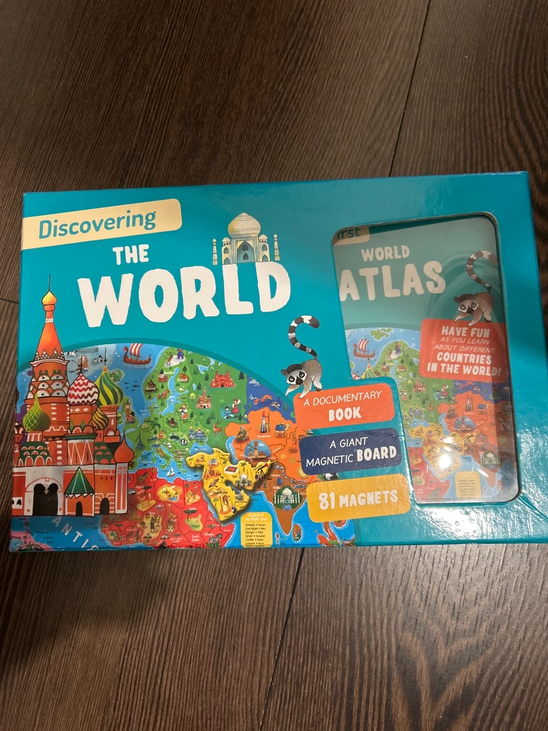 Discovering the World Atlas! It's a documentary book with a giant magnetic board and 81 magnets. Have fun as you learn about different countries in the world