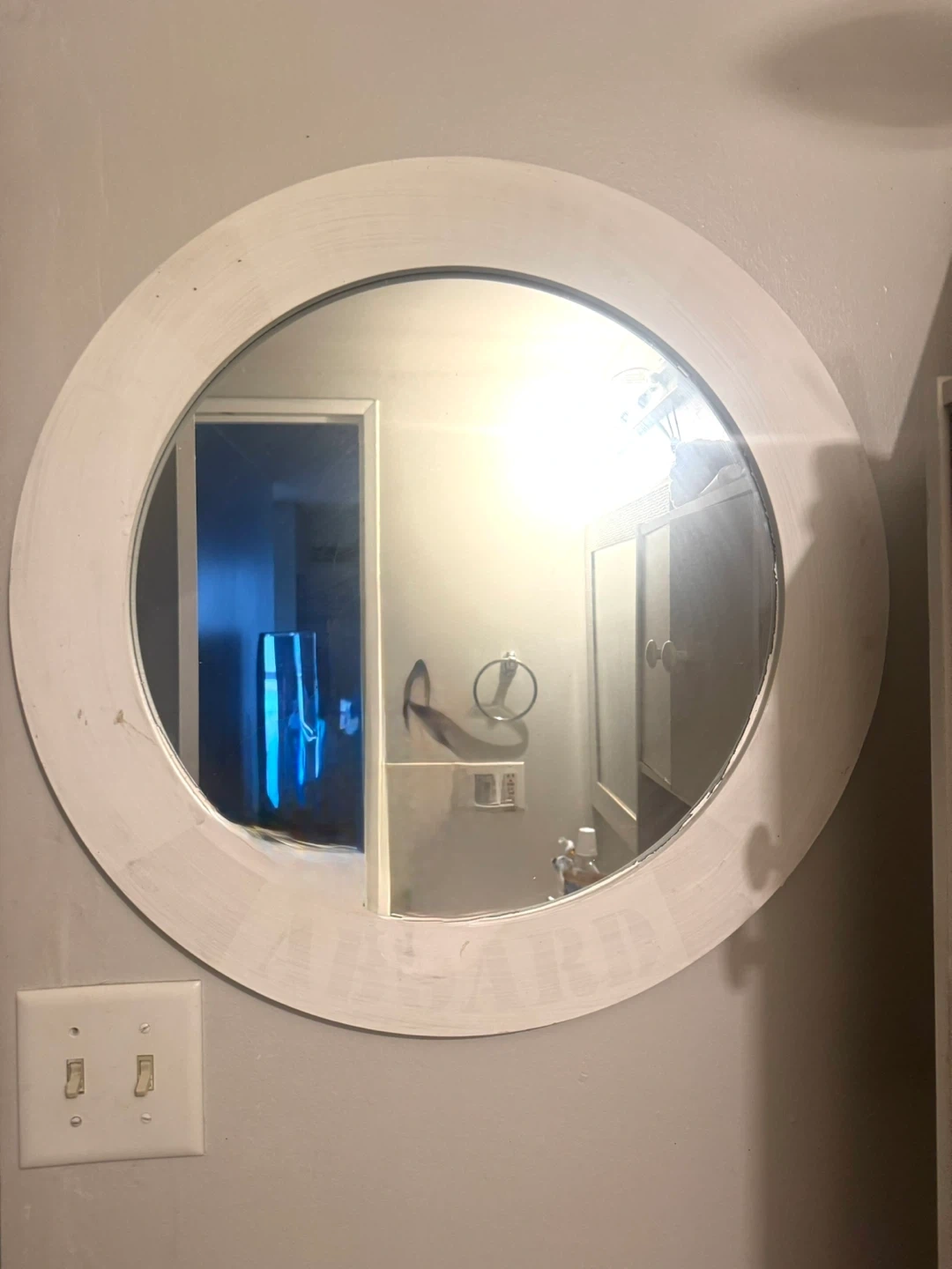 Selling a round wall mirror with a white frame. It's in good condition and would look great in any room! It's a simple yet stylish piece that can add a touch of elegance to your home decor