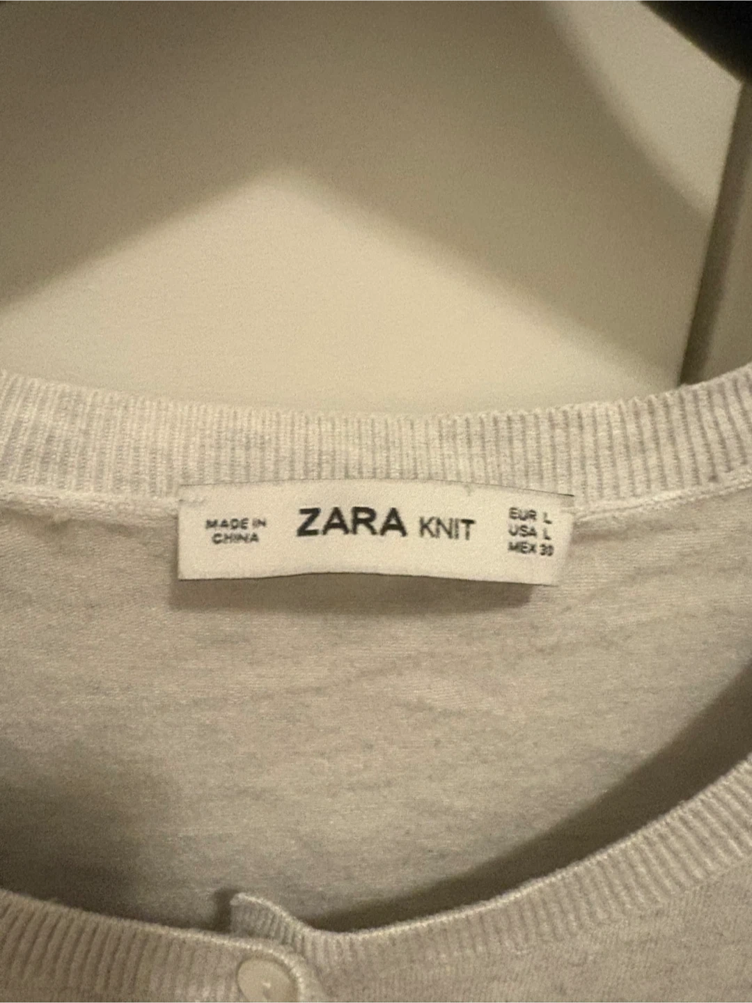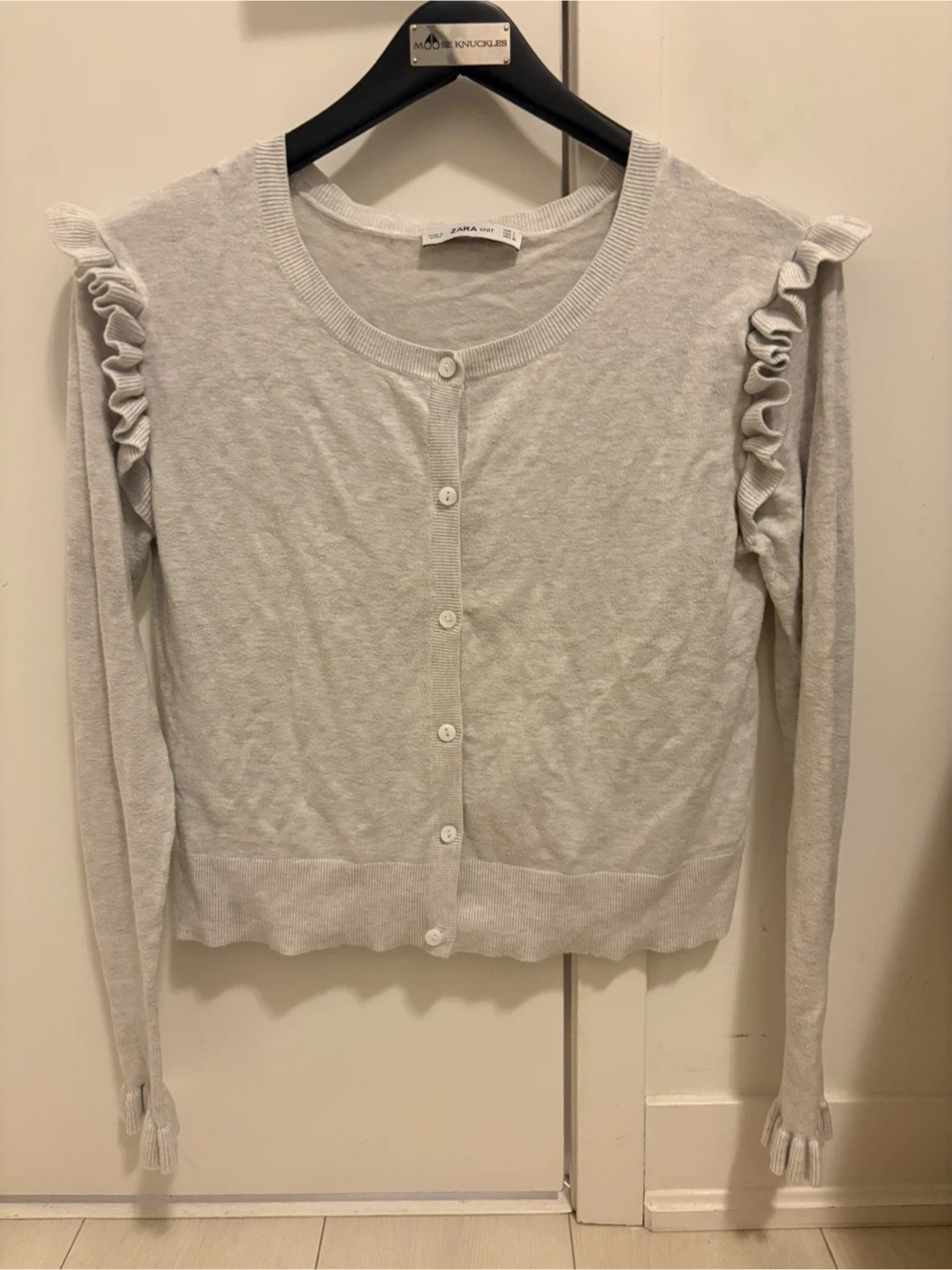 A lovely Zara Knit cardigan in size L! It's a light, neutral colour and features cute ruffle detailing on the shoulders and cuffs. Perfect for layering or wearing on its own