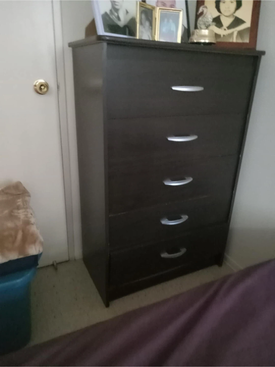 Selling a dark brown dresser with five dresser. Please note that the bottom part of the base is loose and need some stapling. Pick up only in downtown storage area.