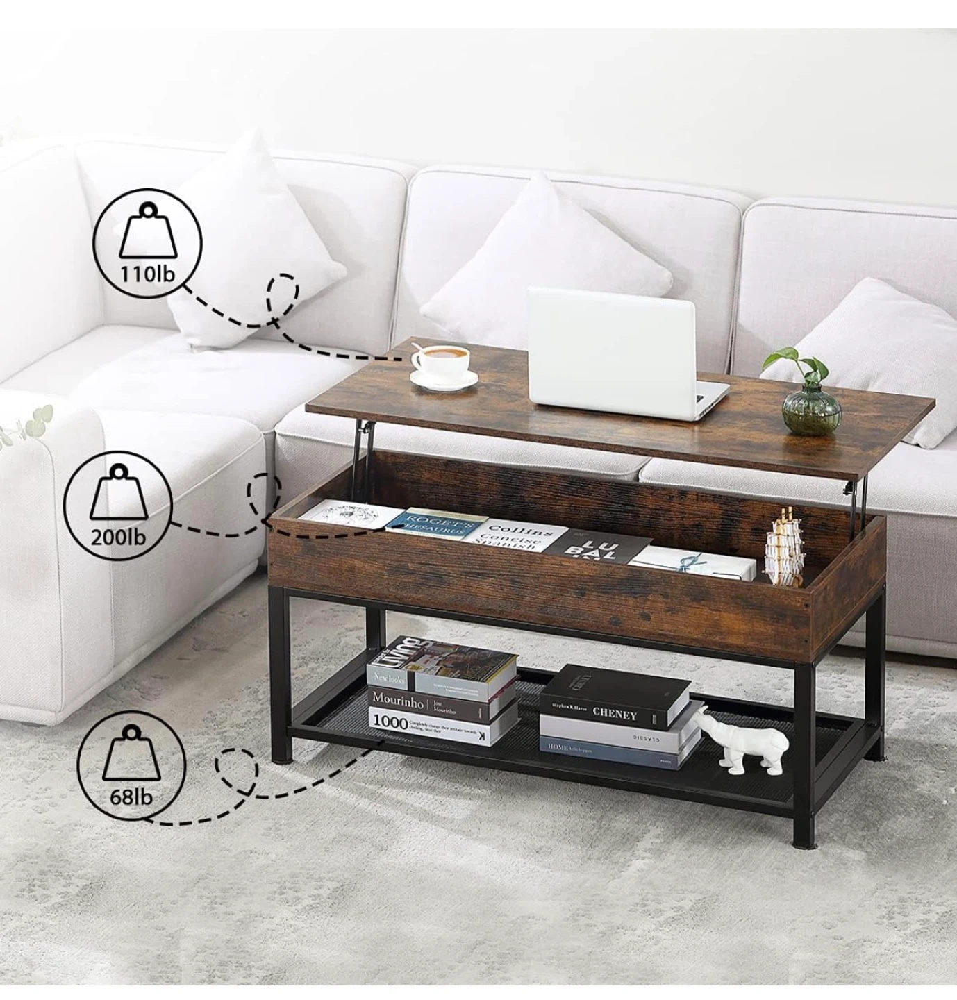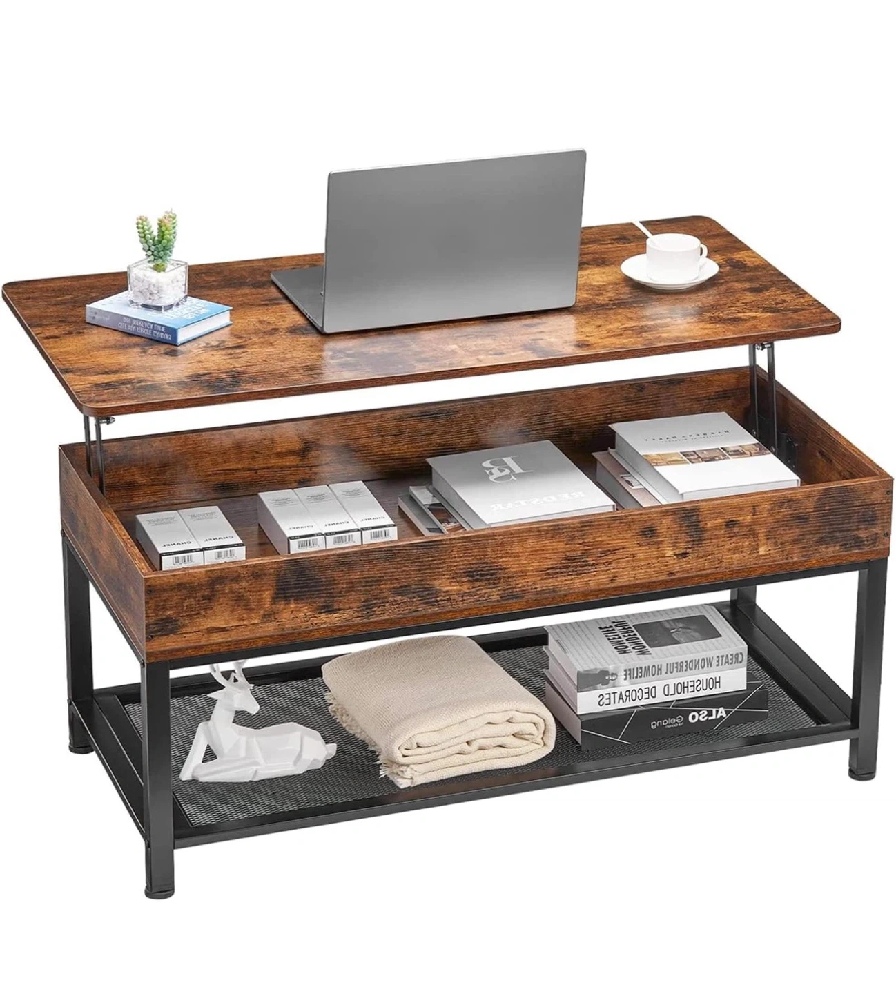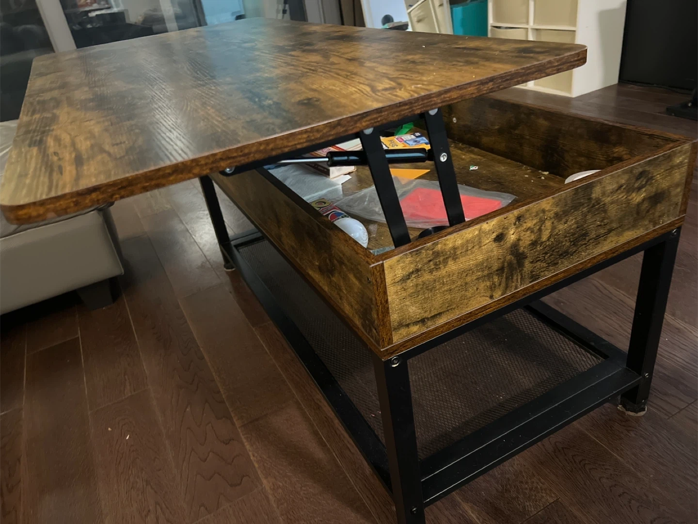 Selling a lift-top coffee table in rustic brown. It's a versatile piece that can be used as a regular coffee table or lifted to create a comfortable workspace or dining surface. It also offers ample storage space inside!