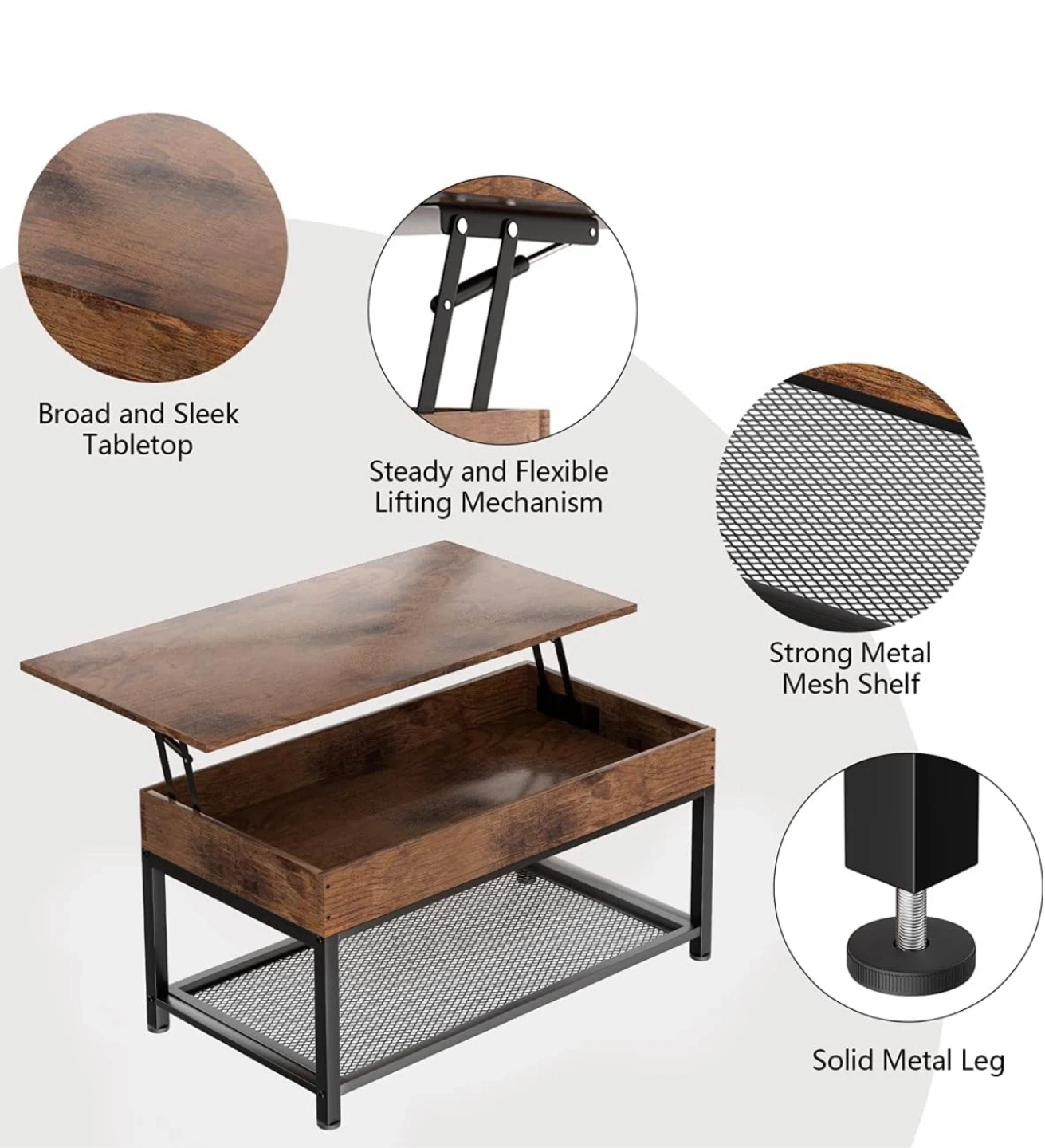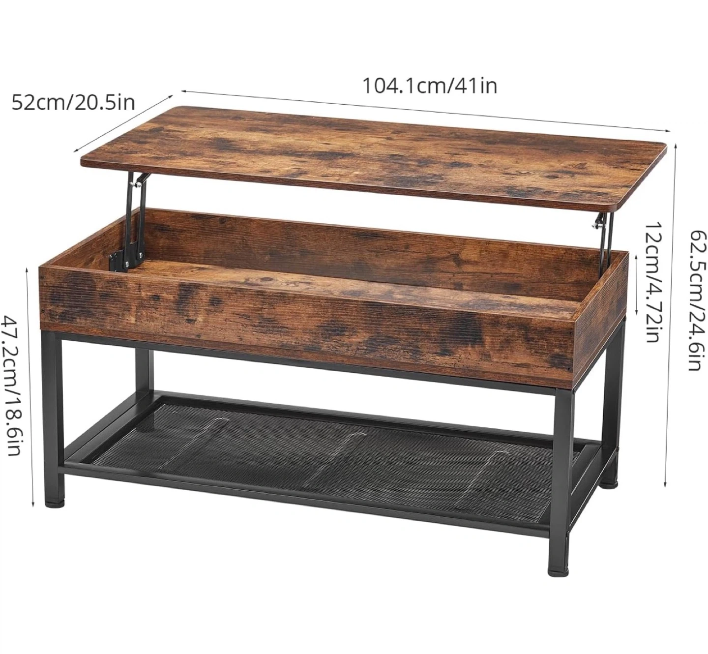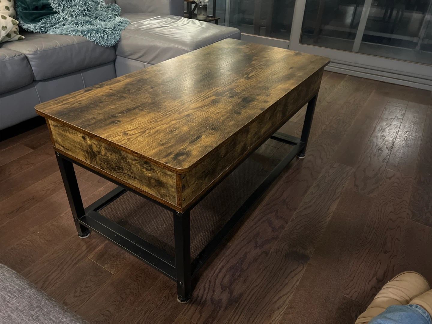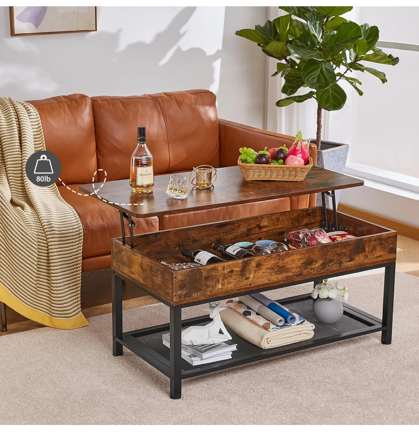 Selling a lift-top coffee table in rustic brown. It's a versatile piece that can be used as a regular coffee table or lifted to create a comfortable workspace or dining surface. It also offers ample storage space inside!