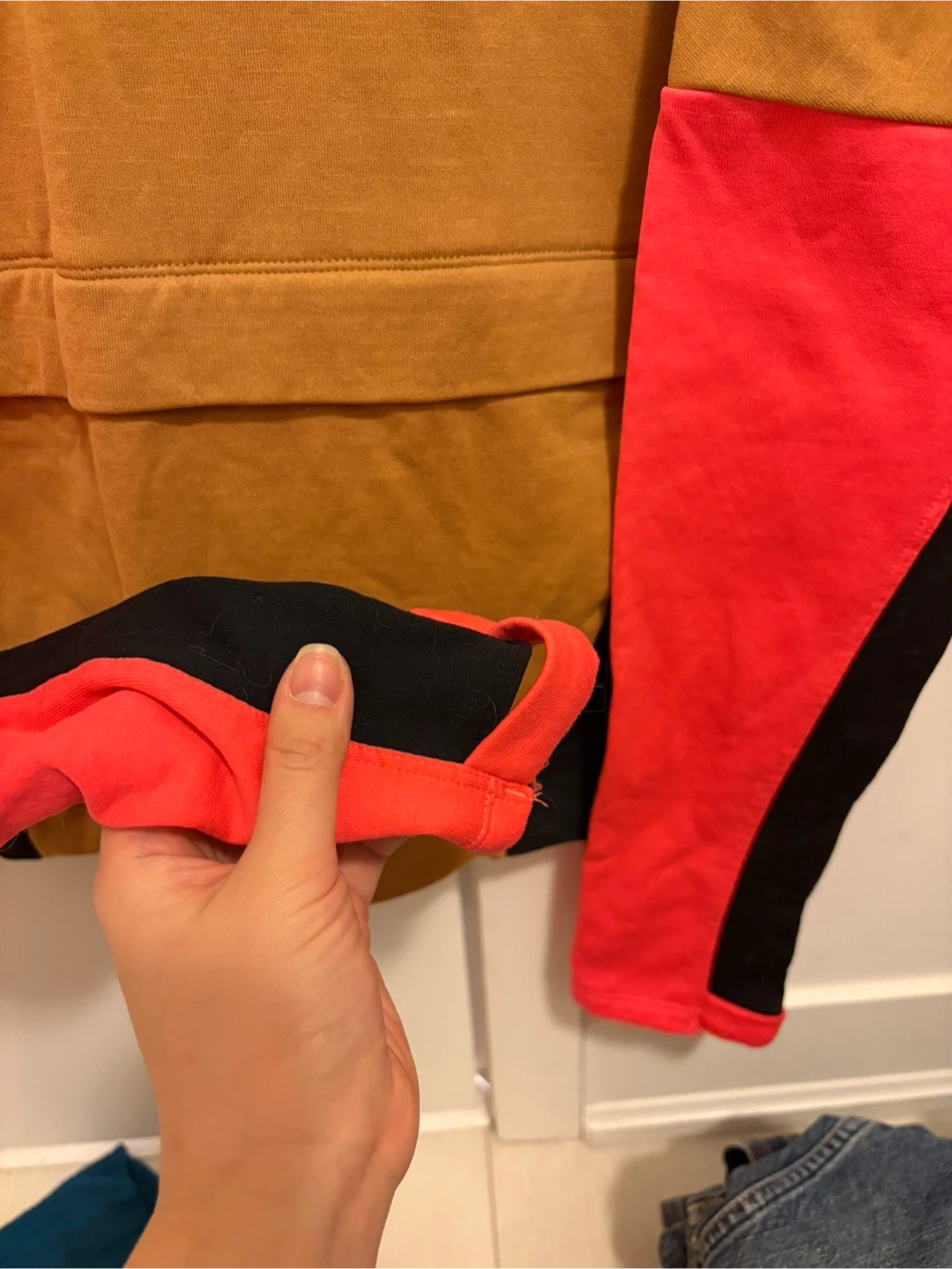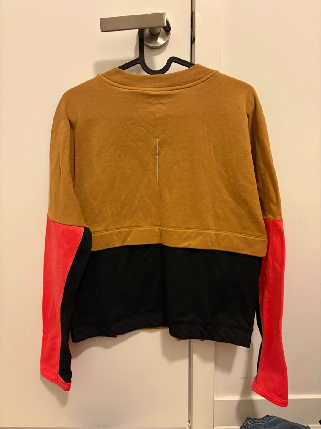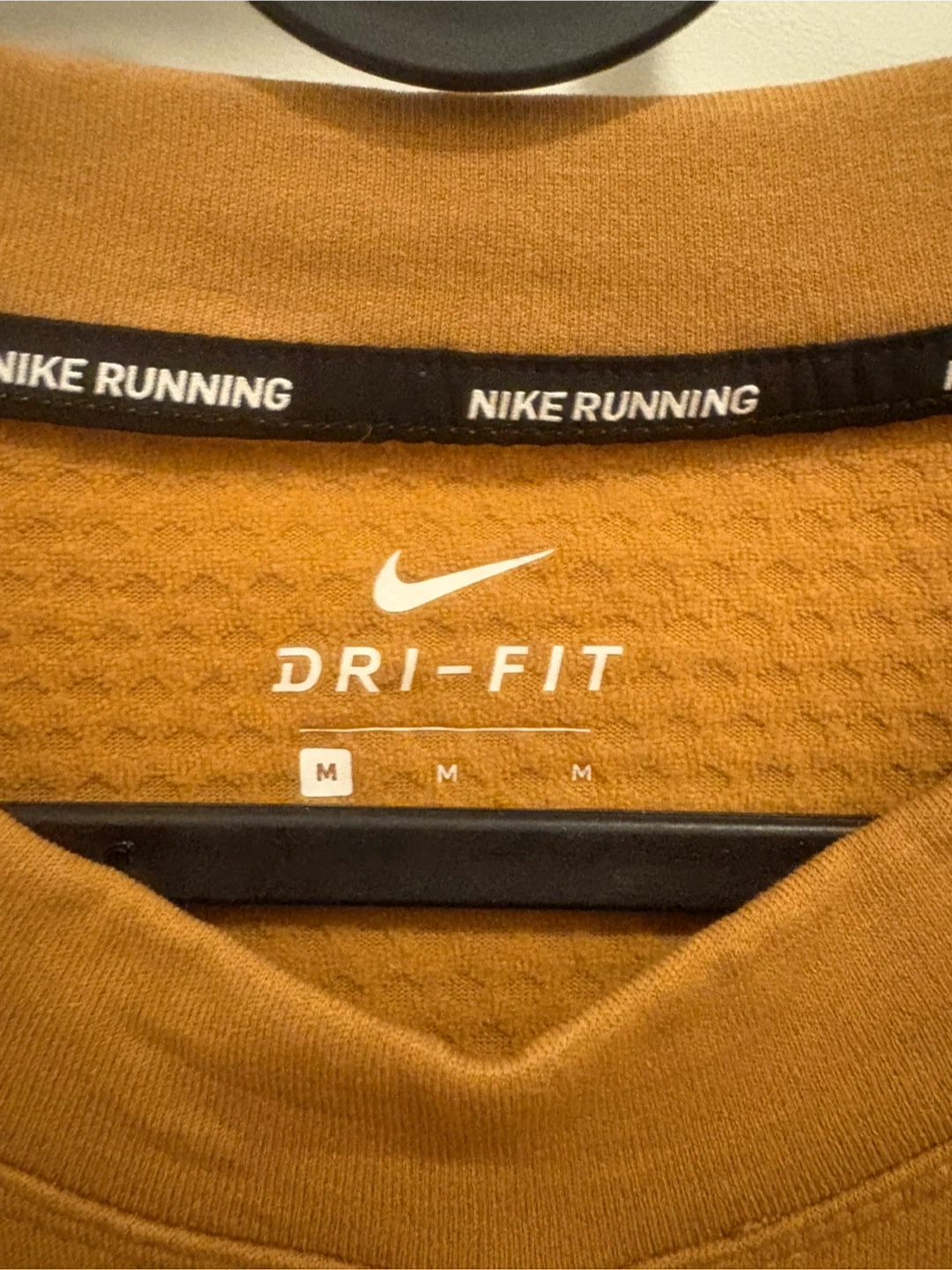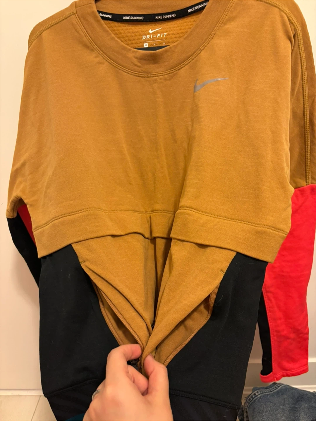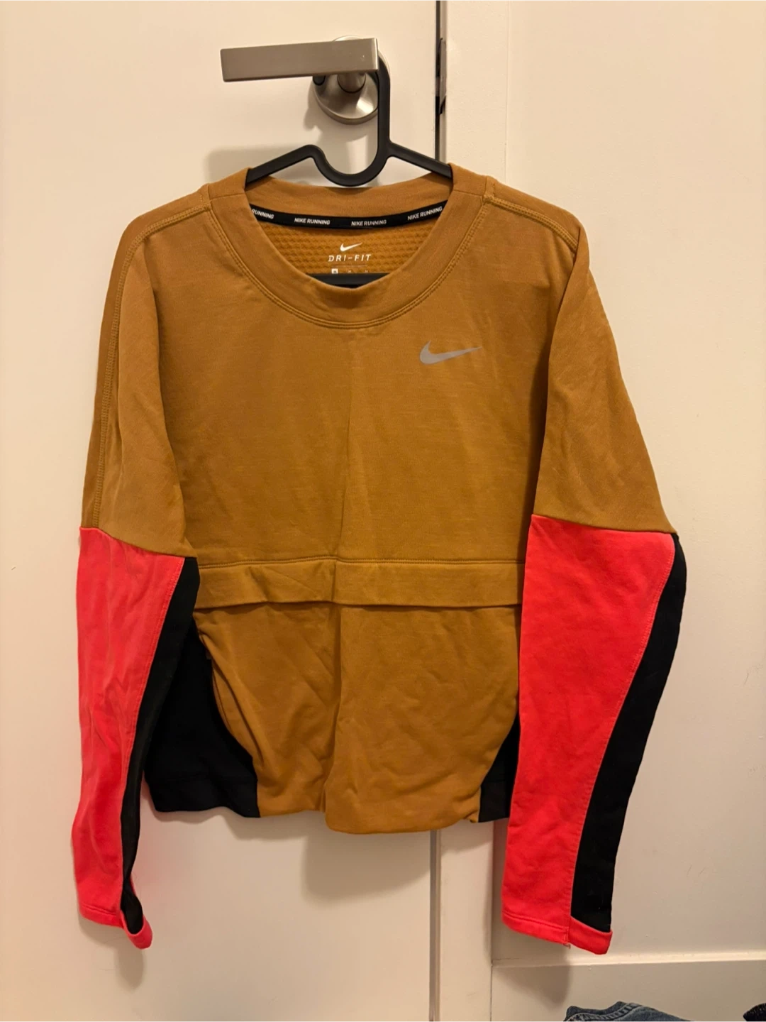 Selling a Nike Dri-FIT running top in size medium! The top features a unique colour block design with gold, red, and black. Perfect for staying comfortable during your runs!