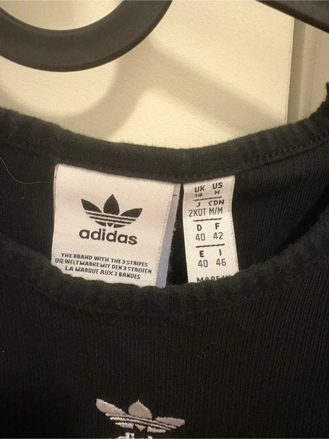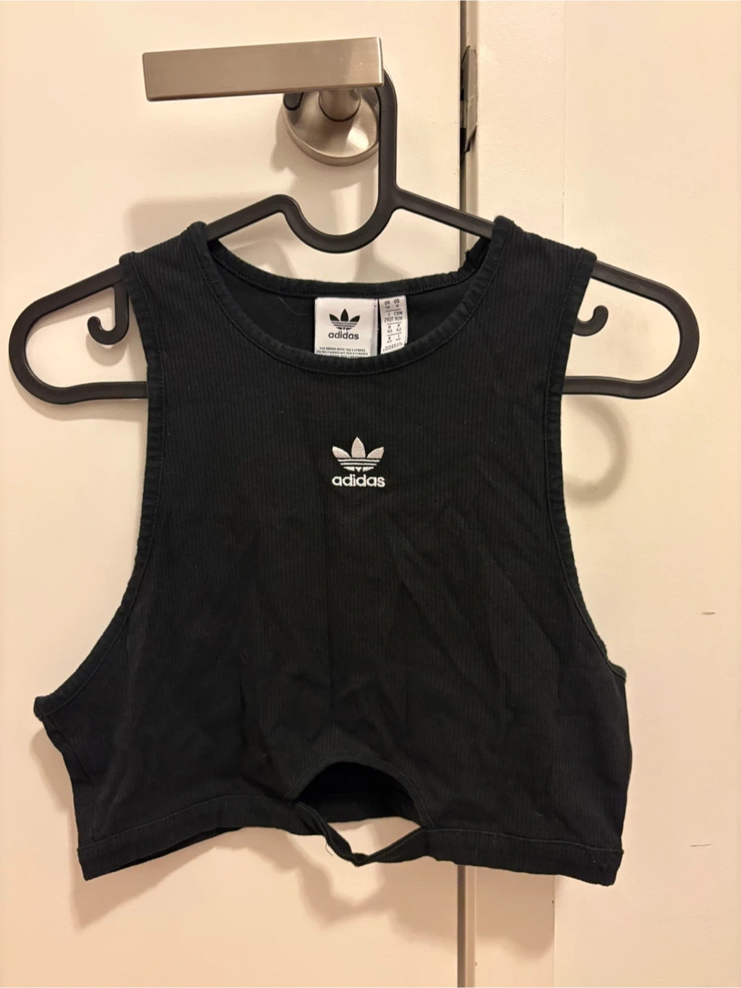 Selling an Adidas black ribbed cropped tank top. It's in great condition and features the classic Adidas logo. Size M
