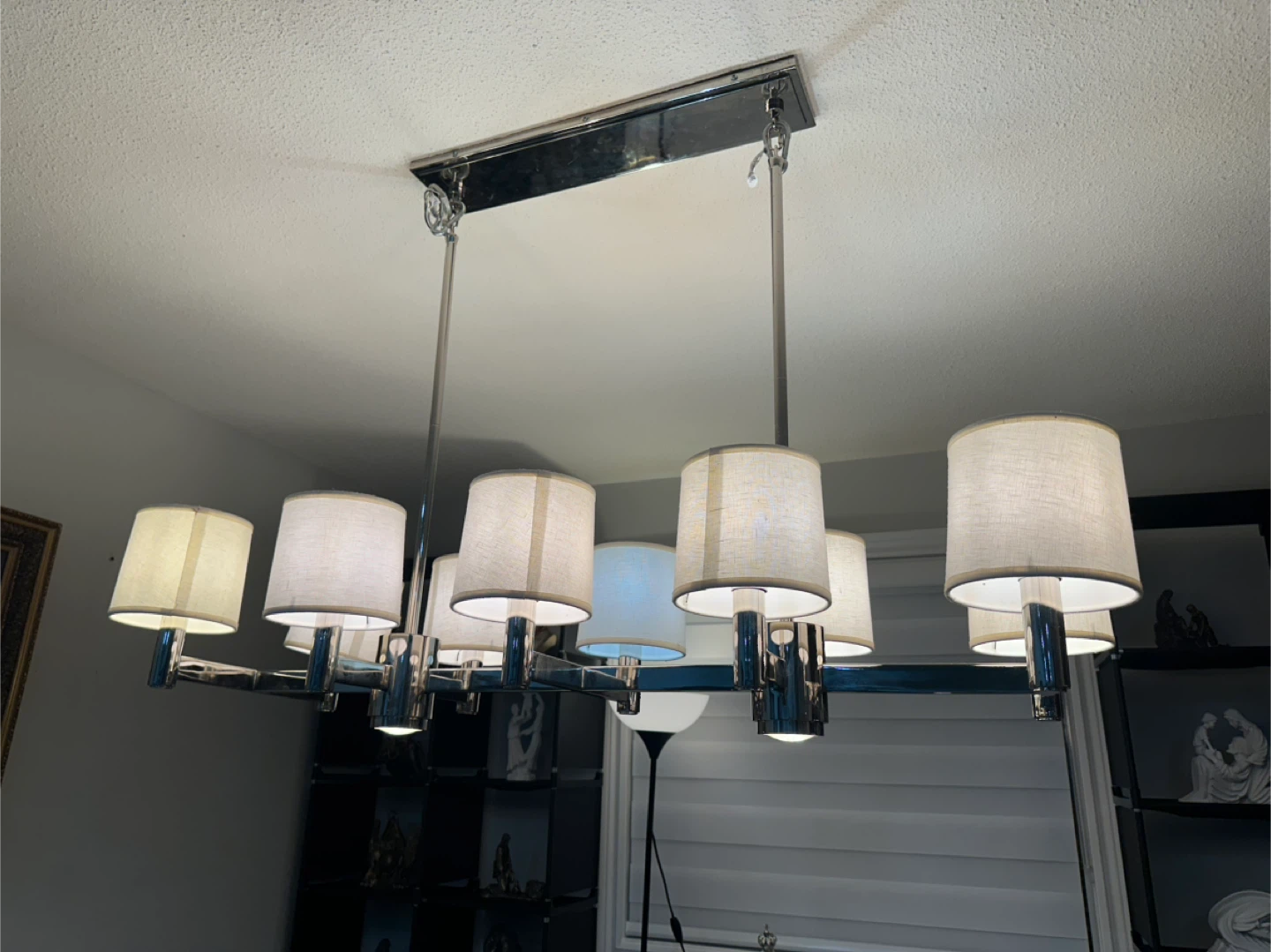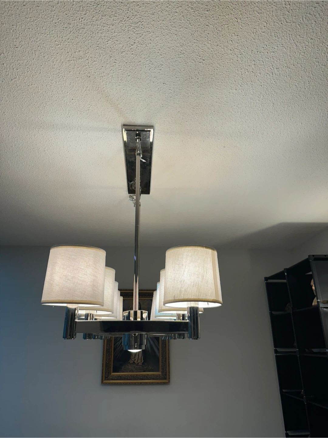 Selling a stylish chrome chandelier. It features multiple lights with fabric shades, perfect for adding a touch of elegance to any room. It's in great shape and ready to brighten up your space
