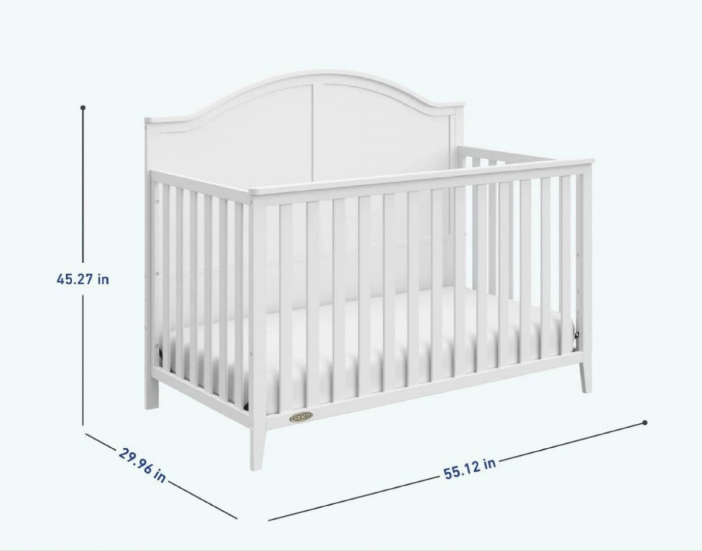This Graco crib is perfect for your little one! It's in great condition and ready for a new home. The crib measures approximately 45.27 inches in height, 29.96 inches in width, and 55.12 inches in length. It's a lovely addition to any nursery