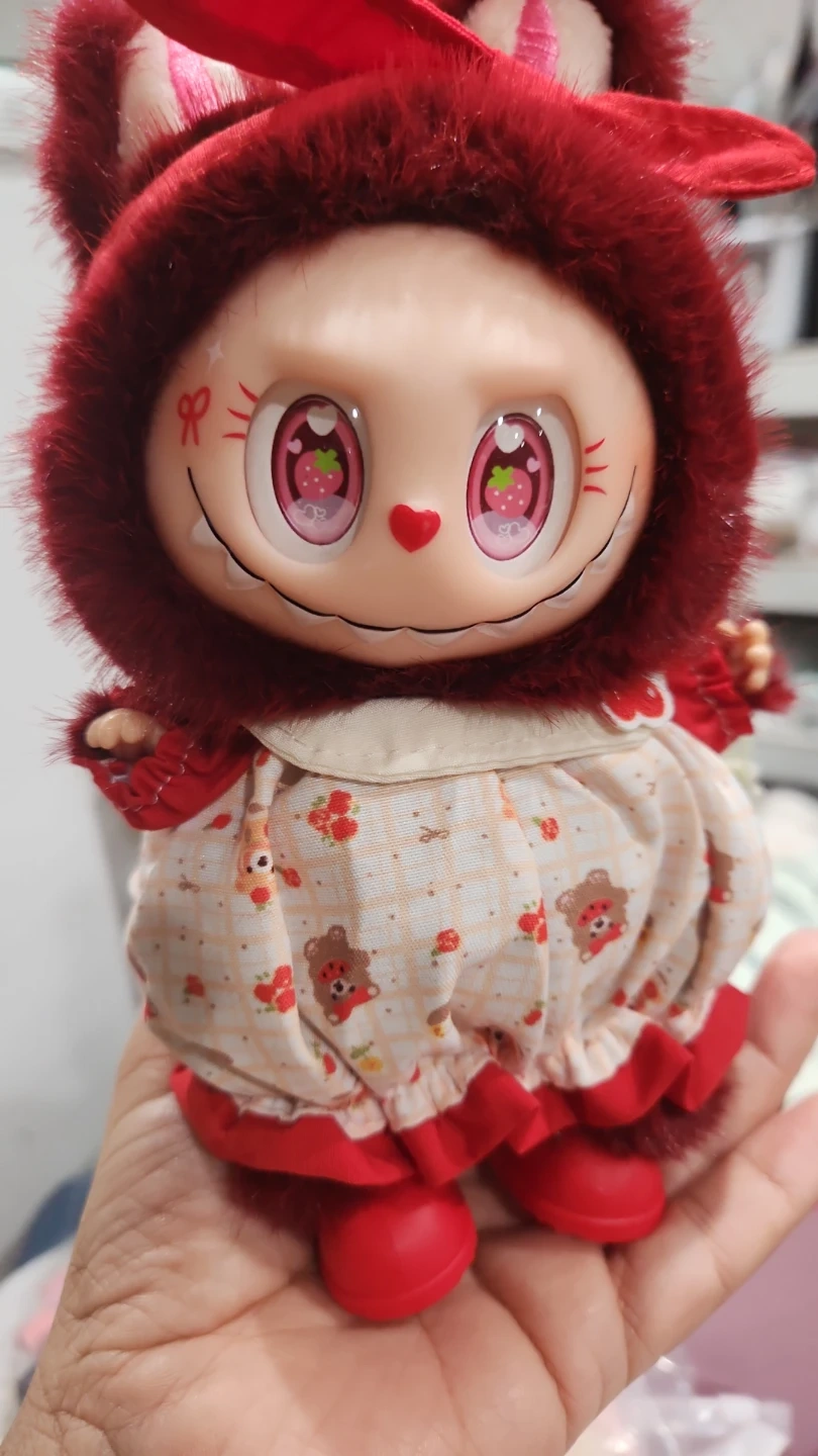 Selling a cute strawberry eyes bubu! It has a red furry hood and a dress with a strawberry and bear pattern. The doll has strawberry details in its eyes and a heart-shaped nose