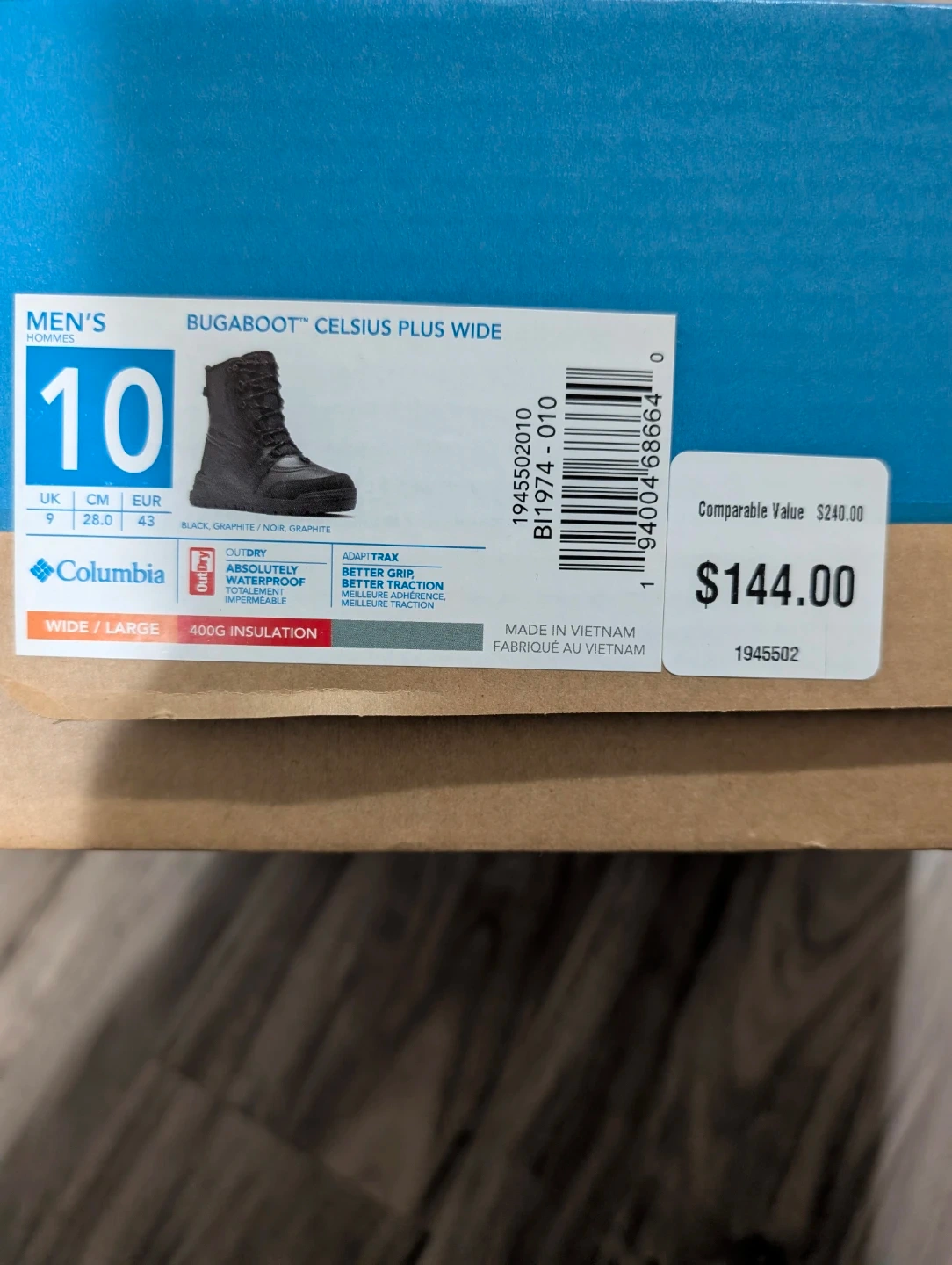 Selling a pair of Columbia Bugaboot Celsius Plus Wide winter boots in men's size US 10. They are black/graphite in colour and come with the original box. These boots feature 400g insulation, are waterproof, and have better grip/traction. Originally bought for $144!
