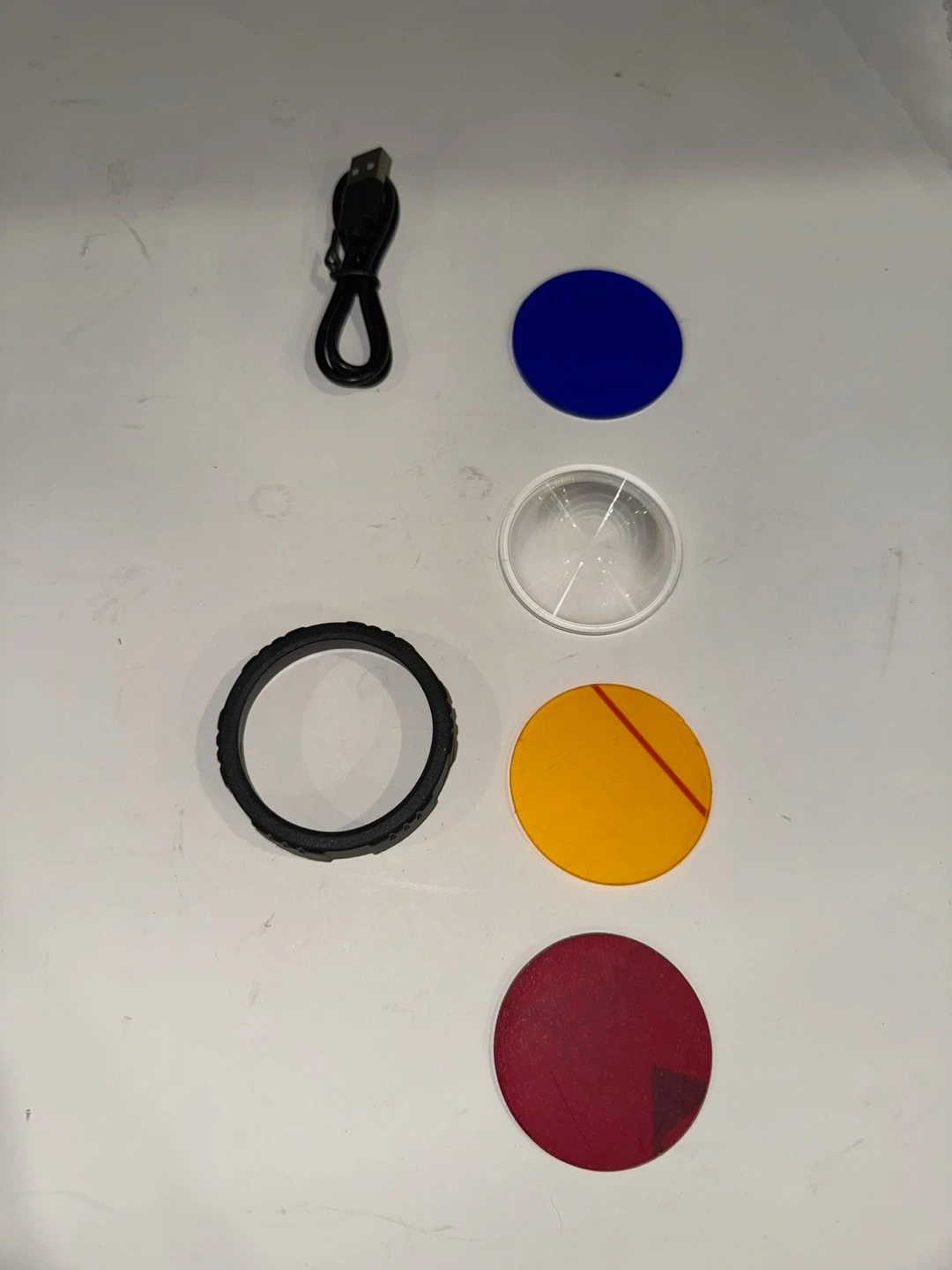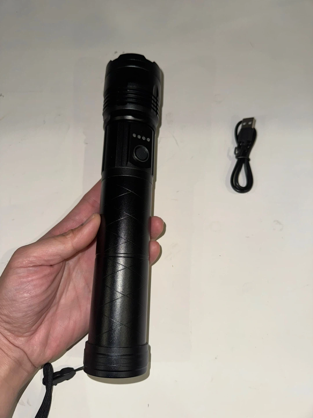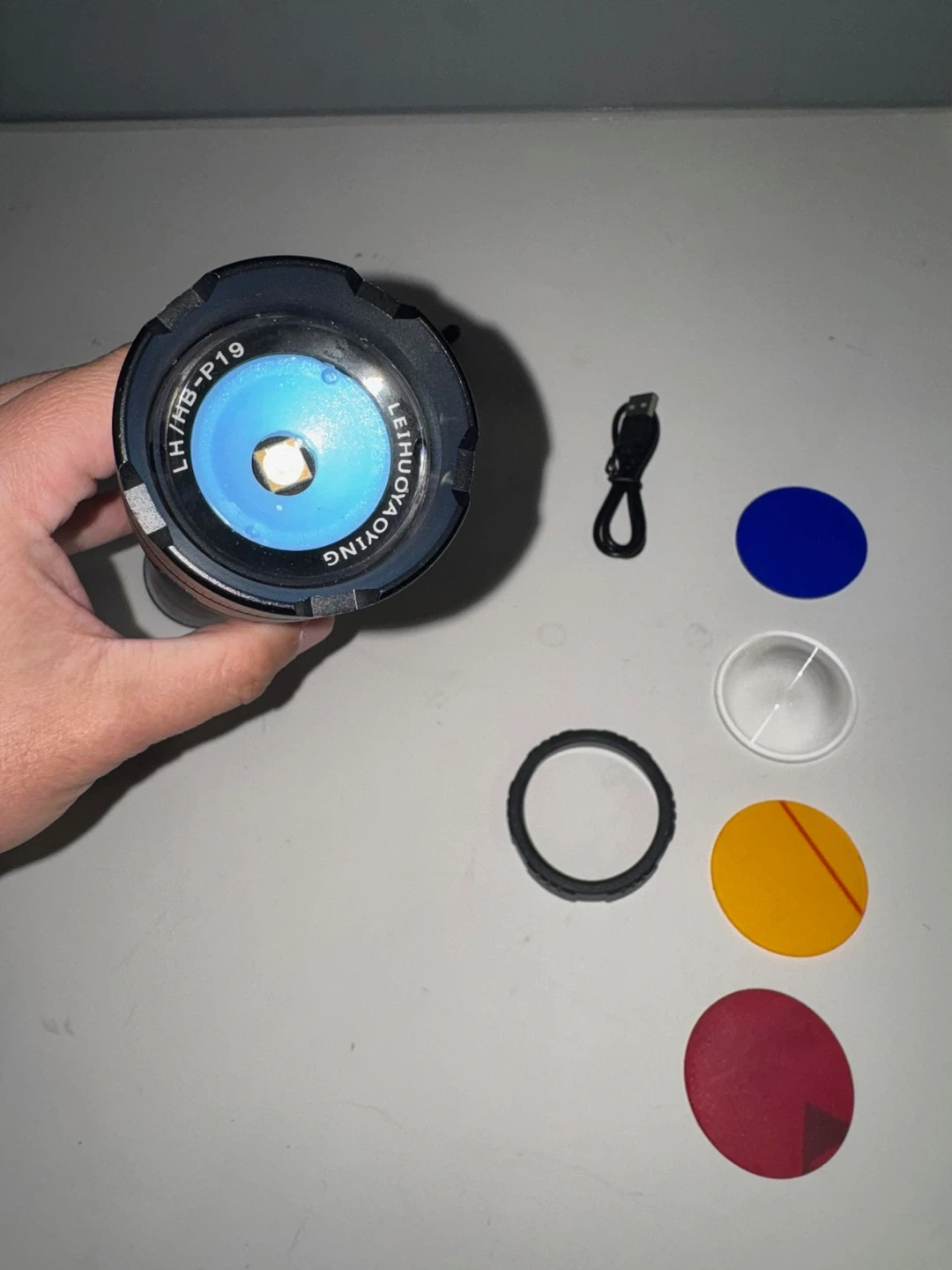 Selling a rechargeable LED flashlight. It comes with multiple colour filters, a charging cable, and three batteries. Great for camping or emergencies!