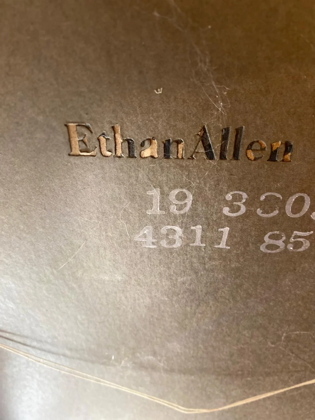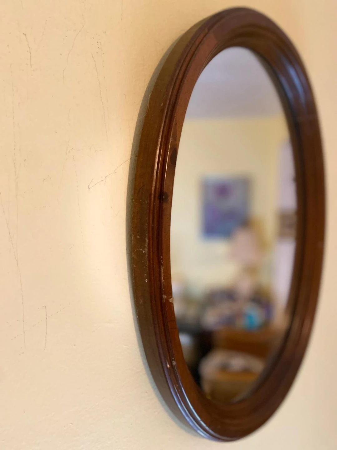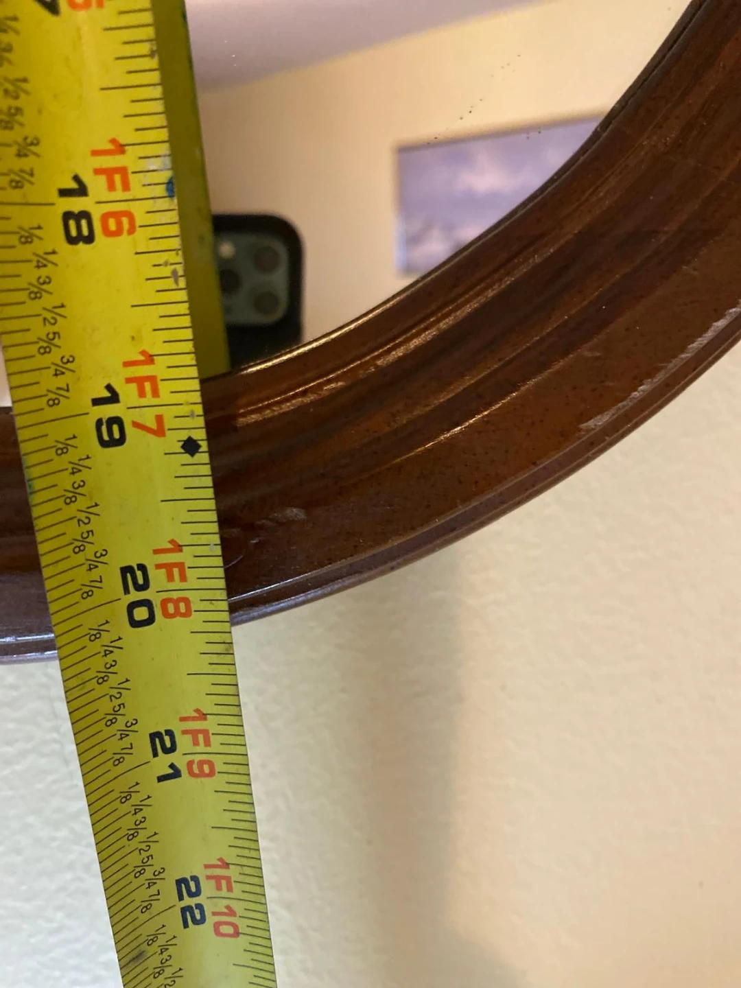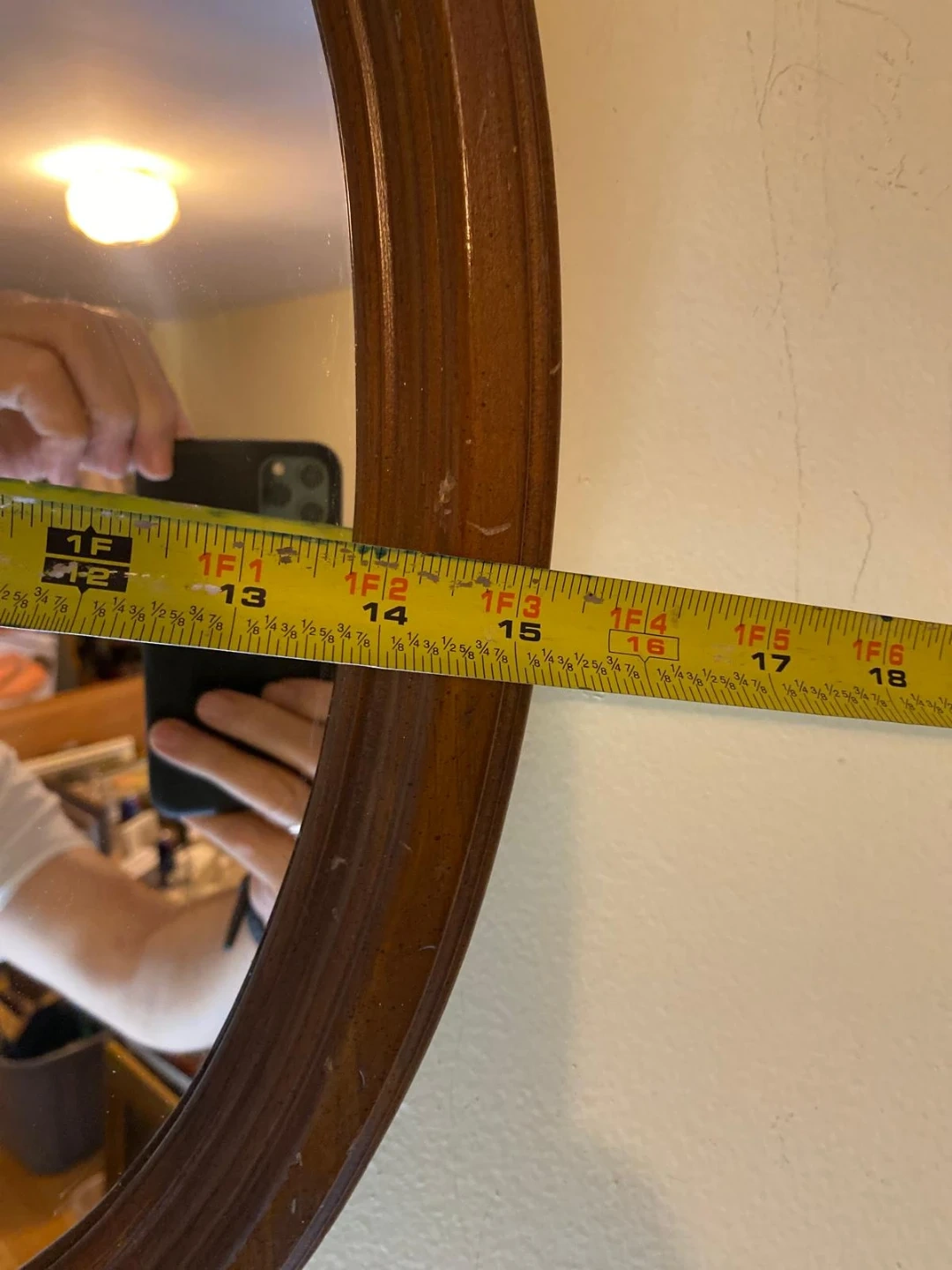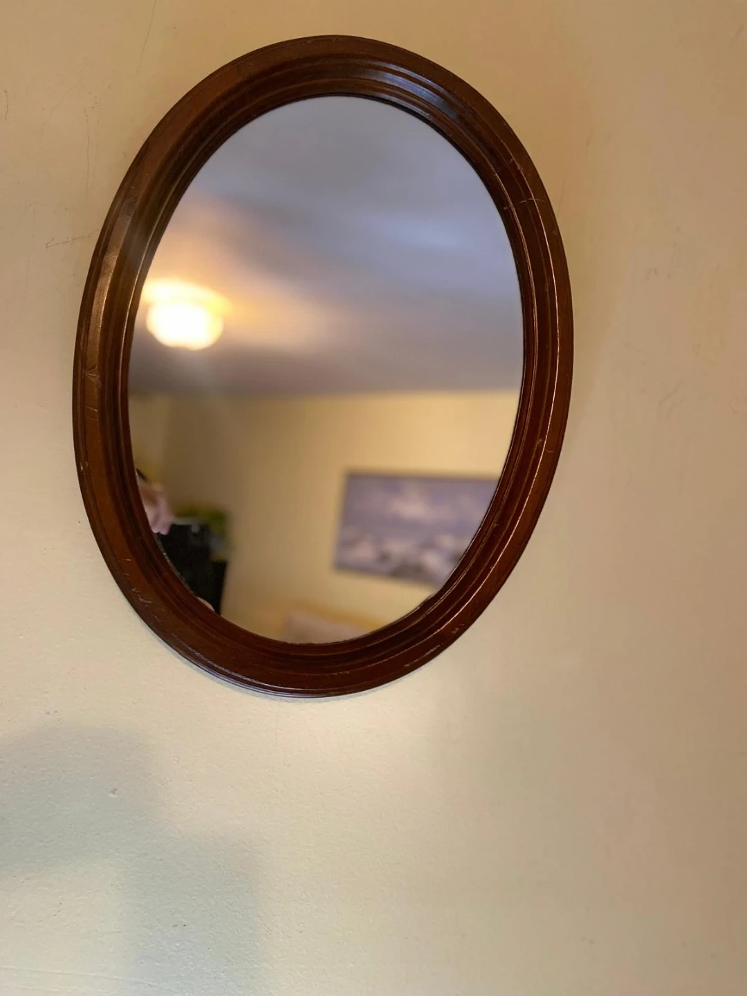 Selling an ethan allen oval mirror with a wood frame. The mirror measures approximately 14 inches wide and 18 inches tall. It's in good condition and ready to hang in your home!