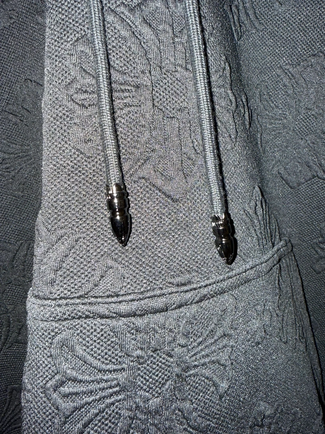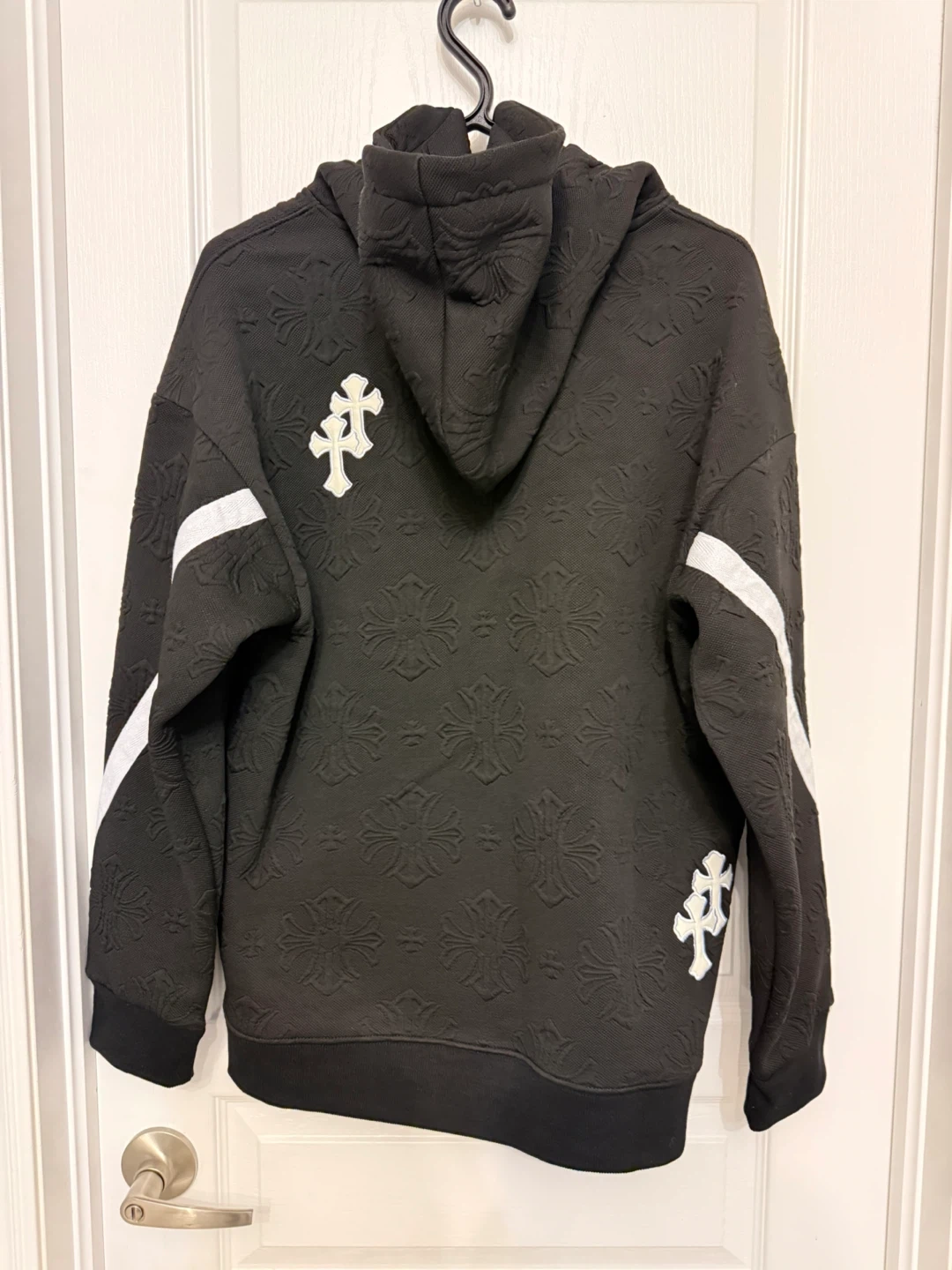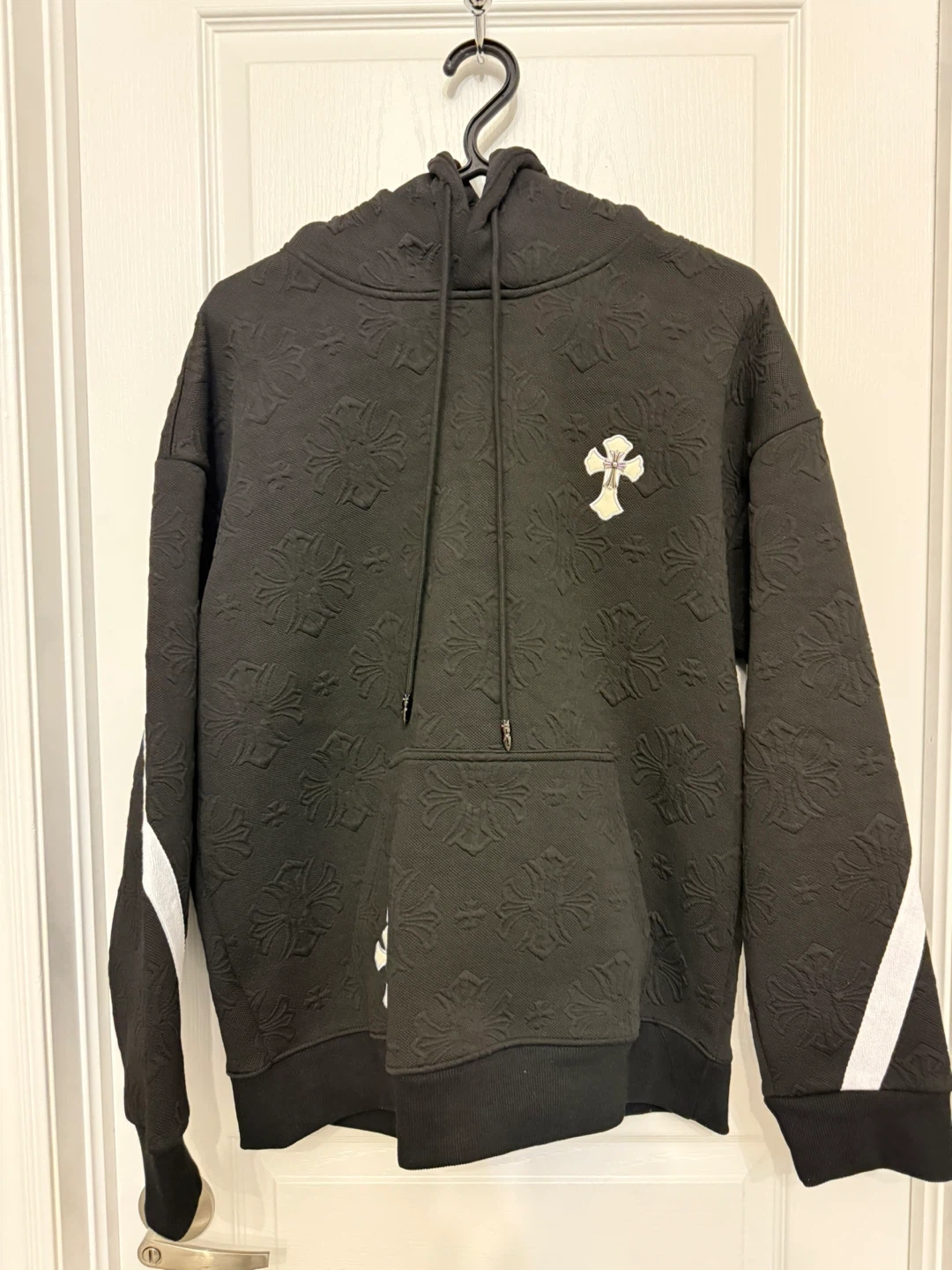 Selling a brand new black hoodie with a unique floral pattern. It's black with white stripes on the sleeves and cross details. Great for adding a bit of edge to your wardrobe!