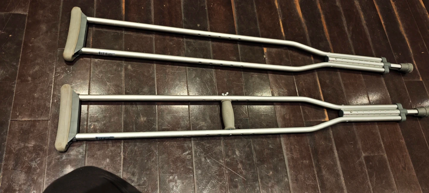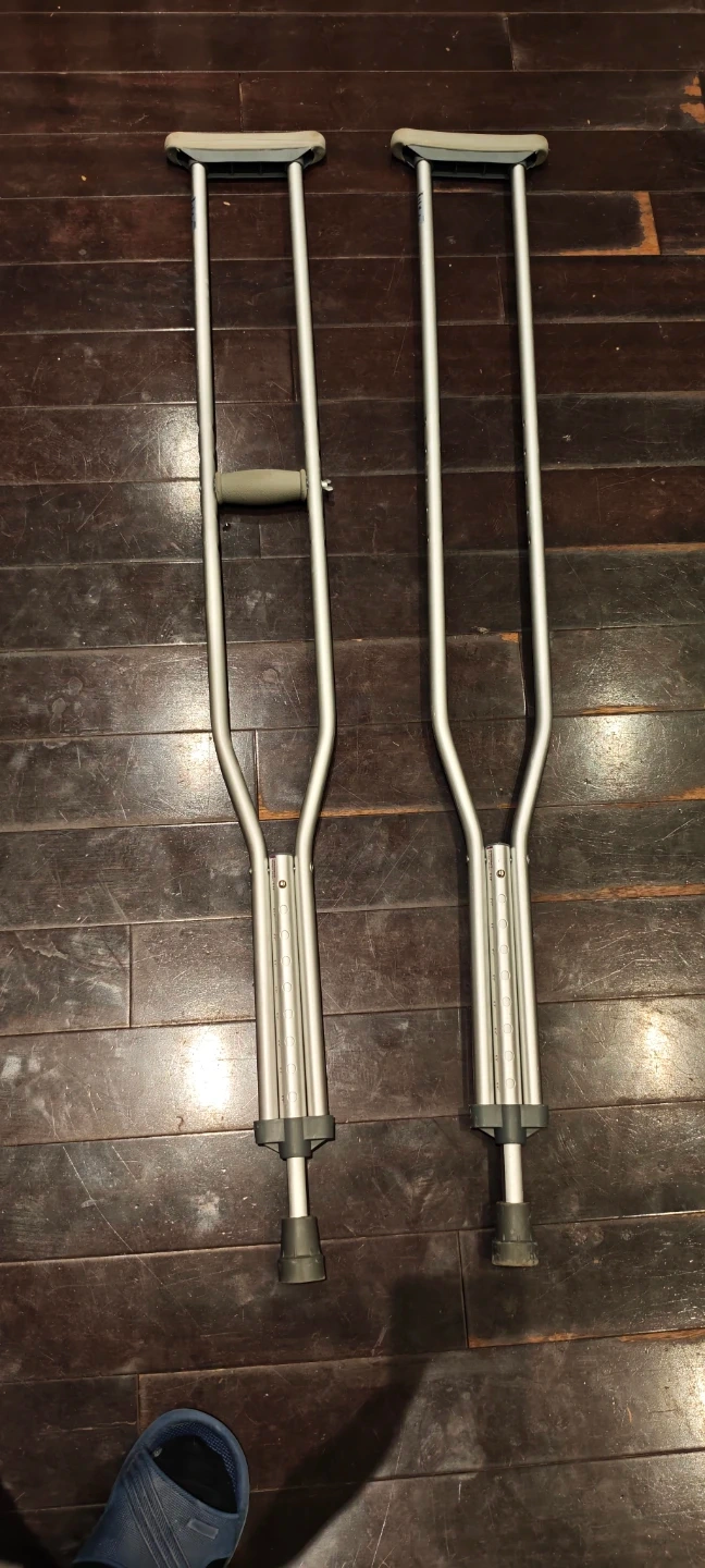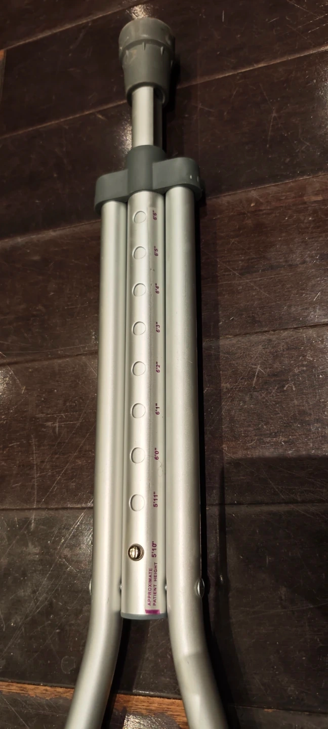 Selling a pair of adjustable aluminum crutches. They are in good condition and ready to help someone in need. The height is adjustable, with markings for patient heights from 5'10" to 6'5".