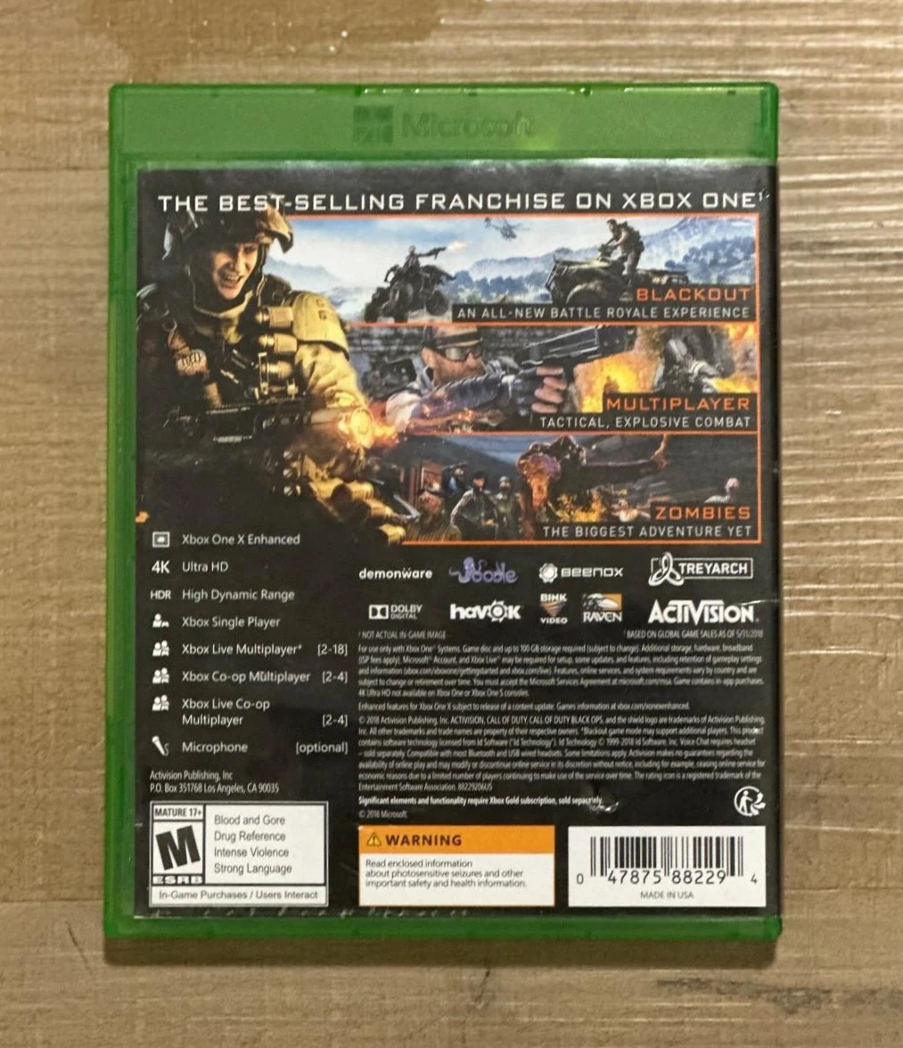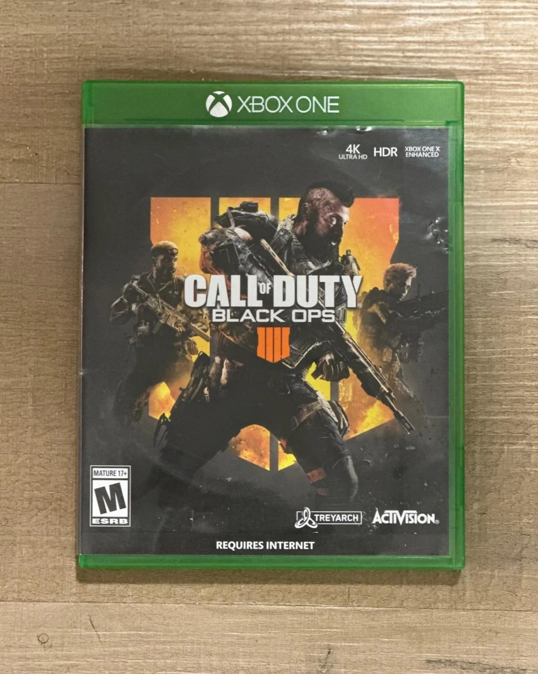 Selling Call of Duty: Black Ops 4 for Xbox One! It features 4K Ultra HD and HDR. Get ready for Blackout, an all-new battle royale experience, plus multiplayer and zombies modes. It's rated M for Mature with blood and gore, intense violence, and strong language