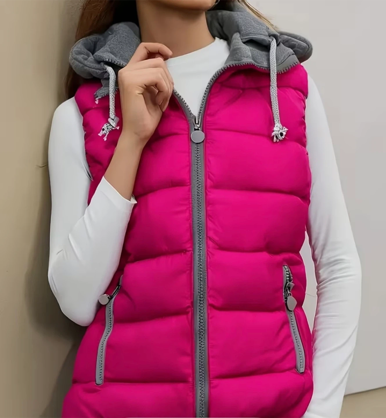 This stylish brand new pink puffer vest is perfect for adding a pop of colour to your wardrobe! It features a cozy grey hood and a comfortable fit. Great for layering during those cooler Canadian days! It’s SLIM FIT, a Large but fits like a medium.