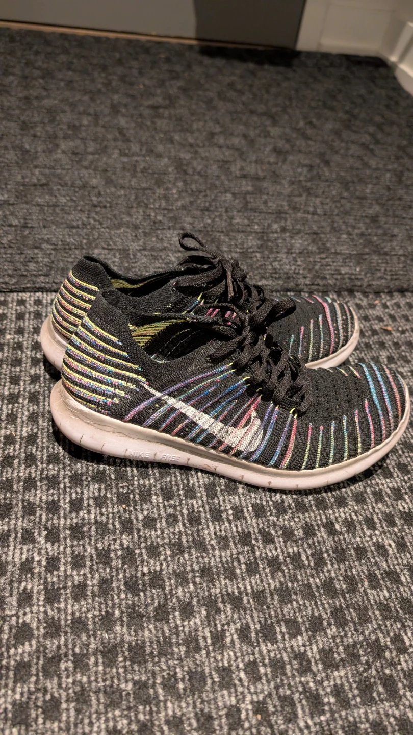 Selling a pair of Nike Free RN Flyknit running shoes! They feature a black knit upper with colourful stripes. Great for running or casual wear. I think it's size 7.5 or 8. No size markings.