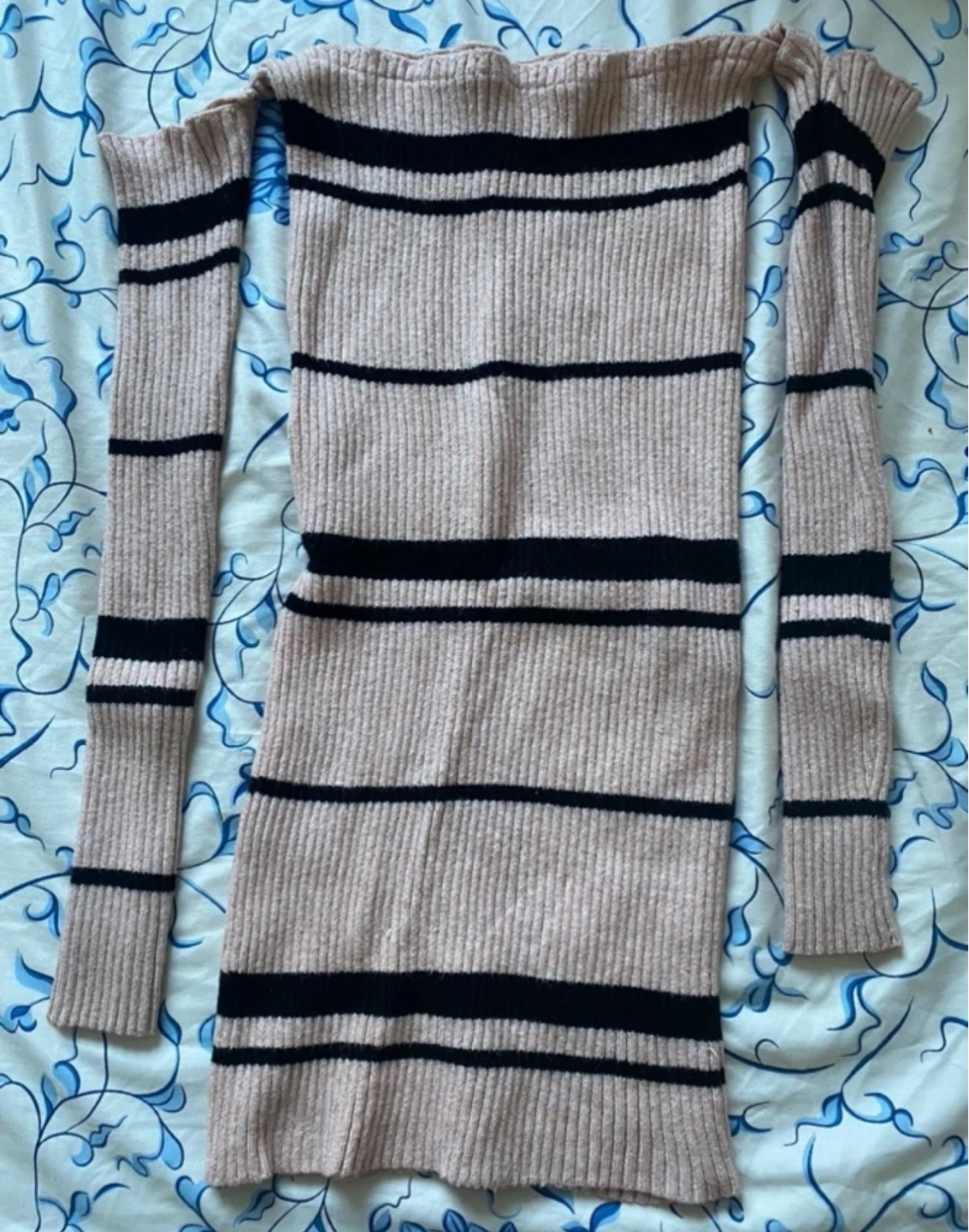 Selling a cute striped knit mini dress! It features a flattering silhouette with long sleeves and an off-the-shoulder design. Perfect for a night out or a casual day look