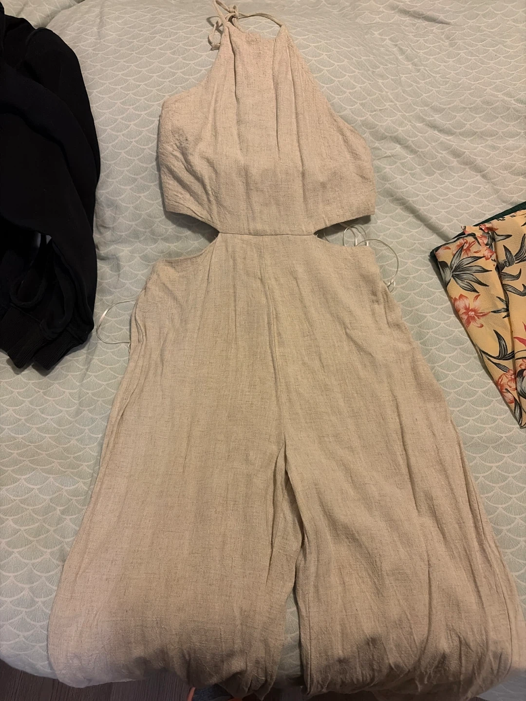 Going away a beige halter jumpsuit with cute side cutouts! It's in great condition and ready for a new owner. The material is linen perfect for summer