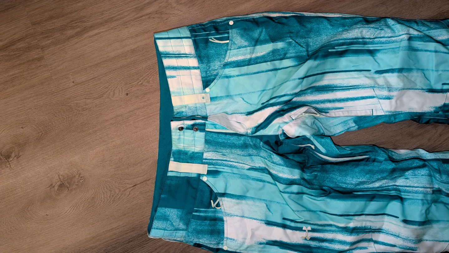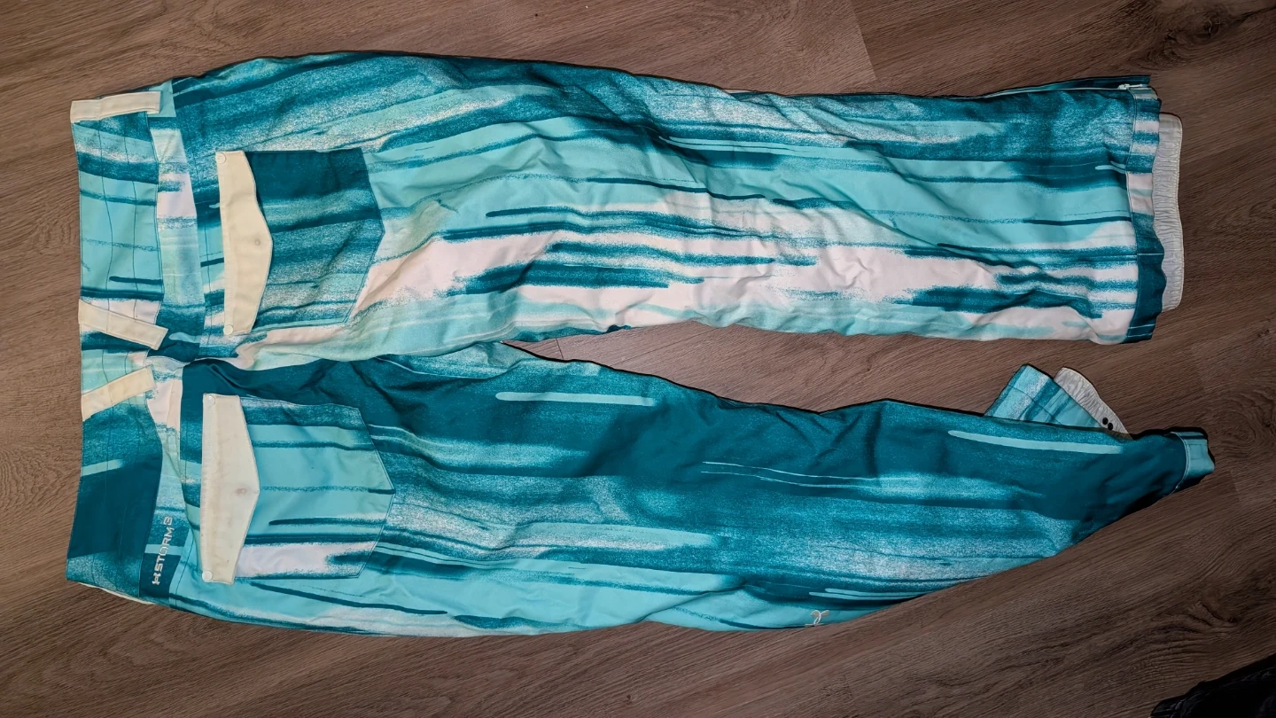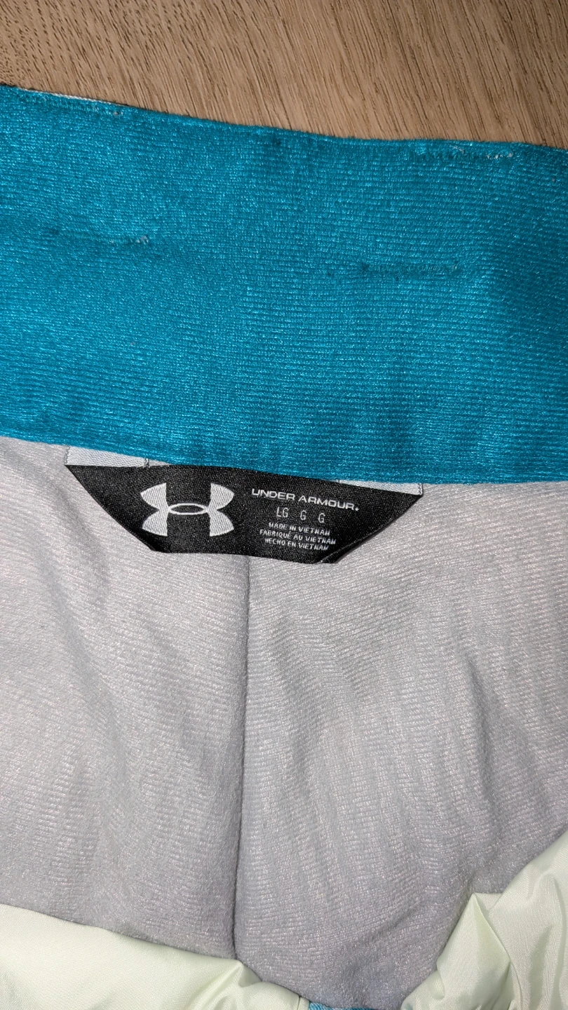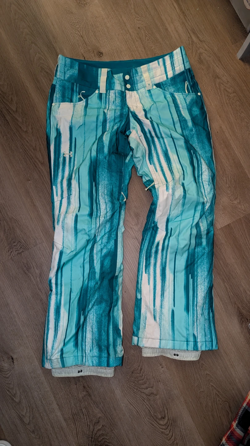 Selling a pair of Under Armour women's snow pants in size large. The pants feature a stylish teal and white design. Has many pockets and thigh vents. Fits true to size but selling because it is a bit low rise on me and not my preference. Only used a handful of times. Looks a bit more greenish teal in person. Great for snowboarding or skiing.