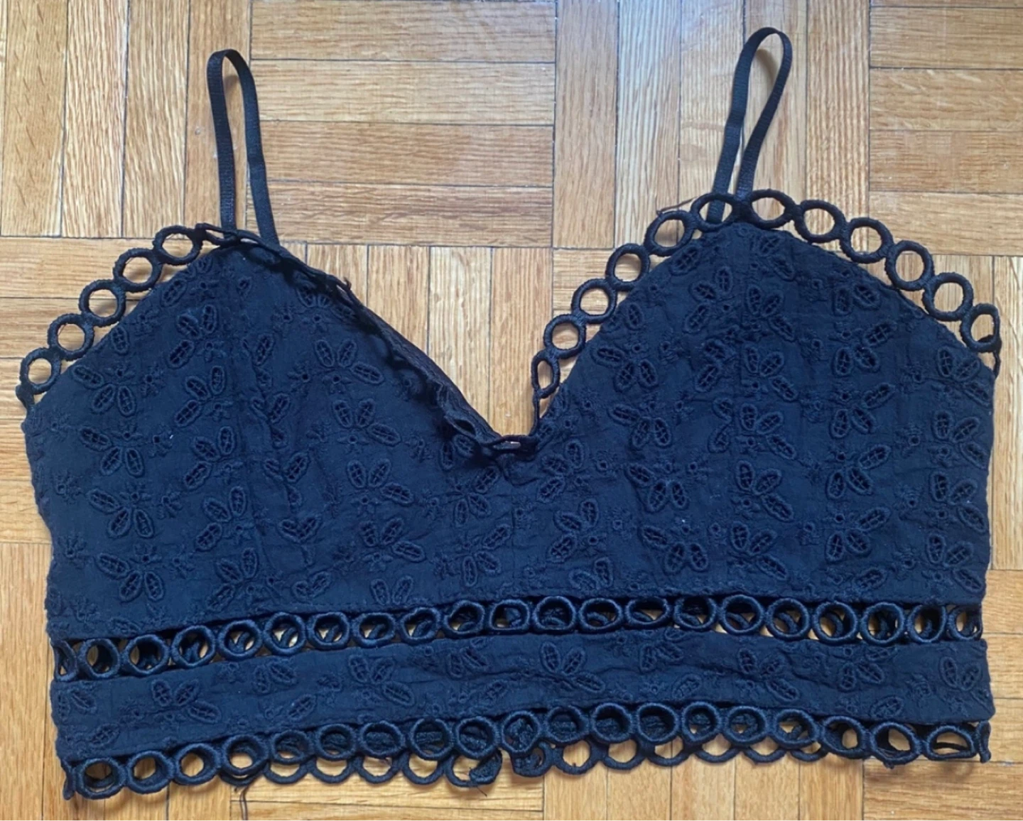 Selling a cute black crop top! It has a detailed design and is in great condition. Perfect for summer or layering, it's a stylish addition to any wardrobe.