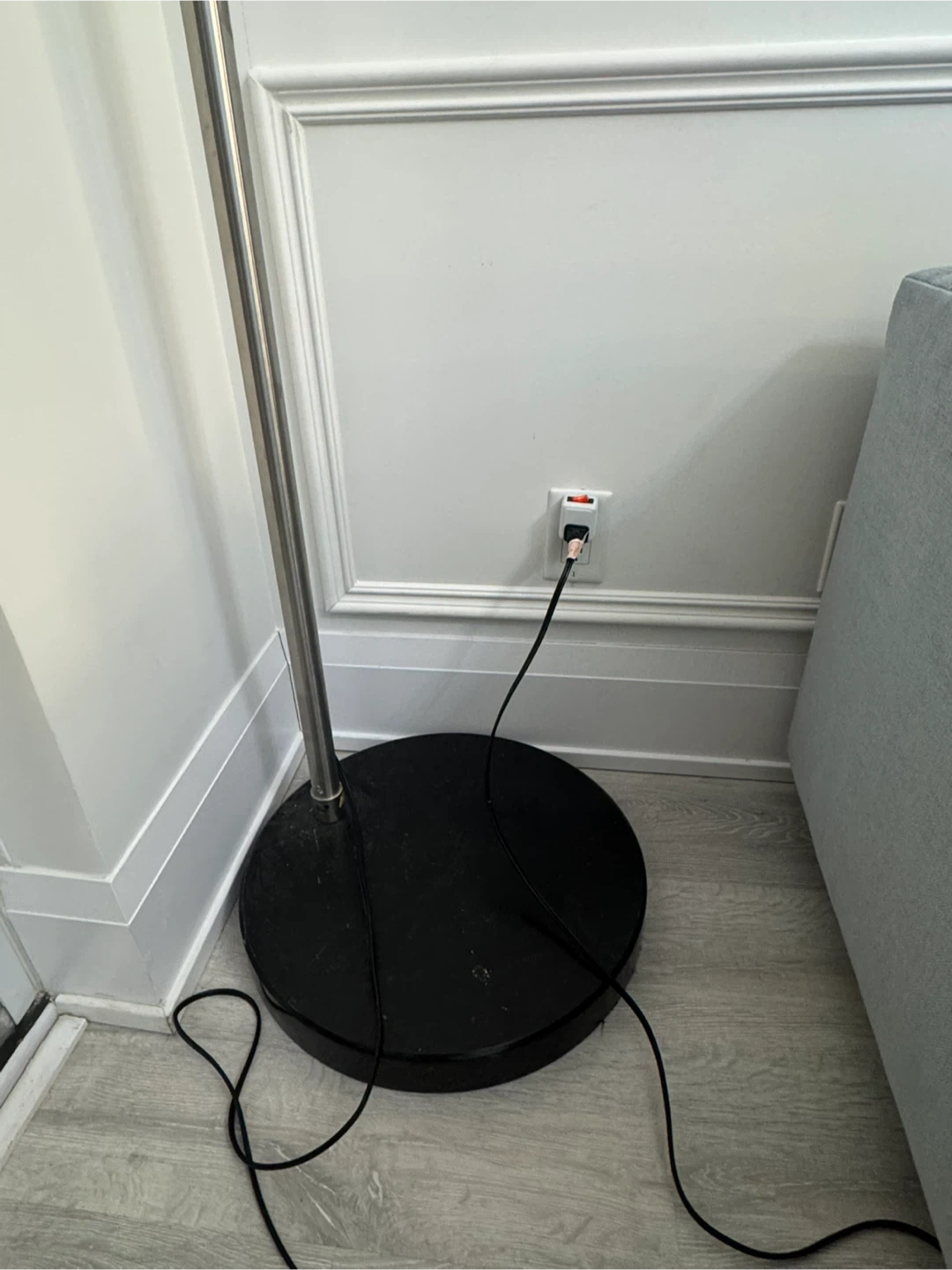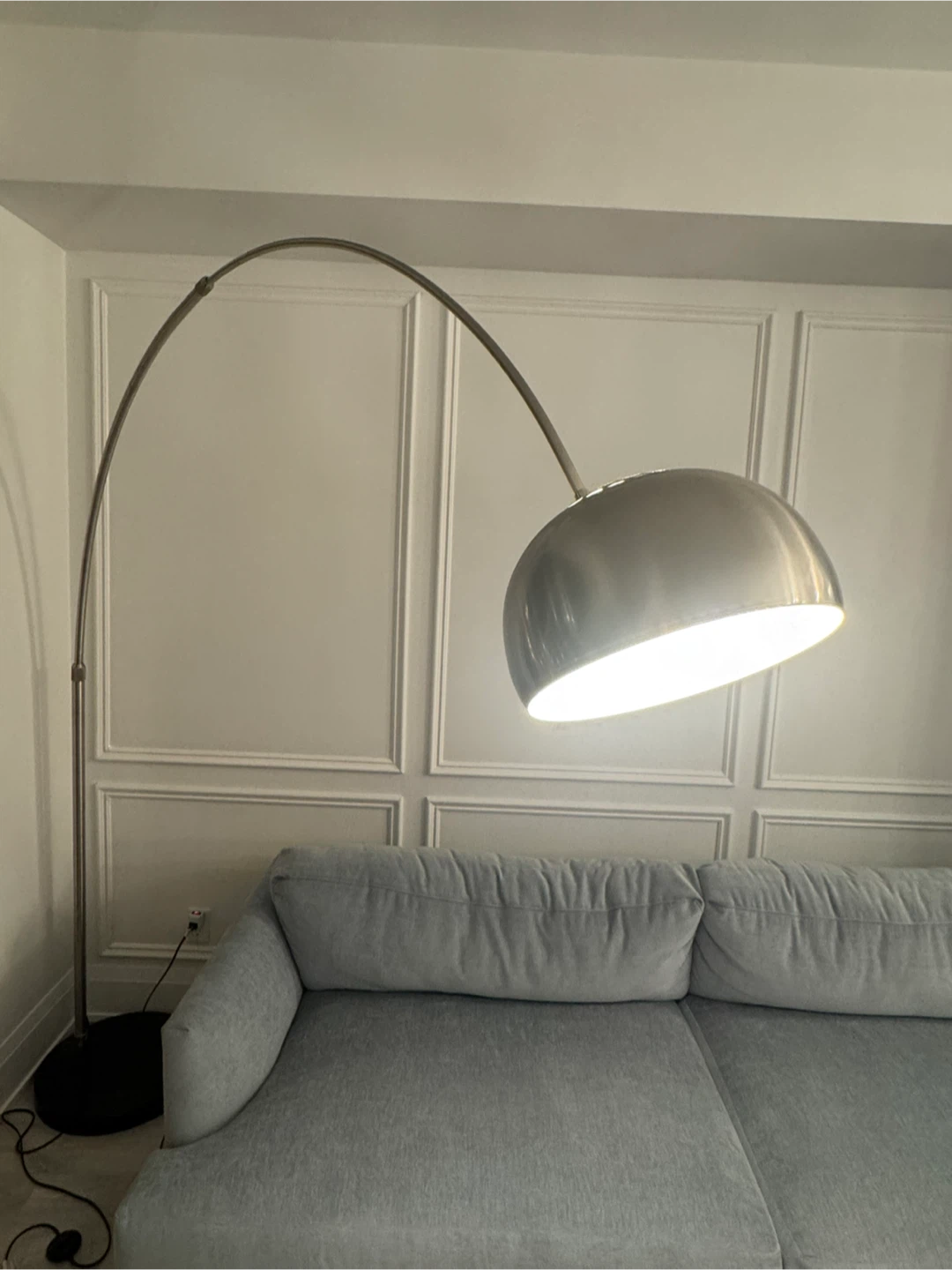 Add a touch of modern elegance to your living space with this stylish arc floor lamp! The lamp features a sleek silver finish and a sturdy base. It's perfect for providing ambient lighting in any room. It has a black base and silver finish.