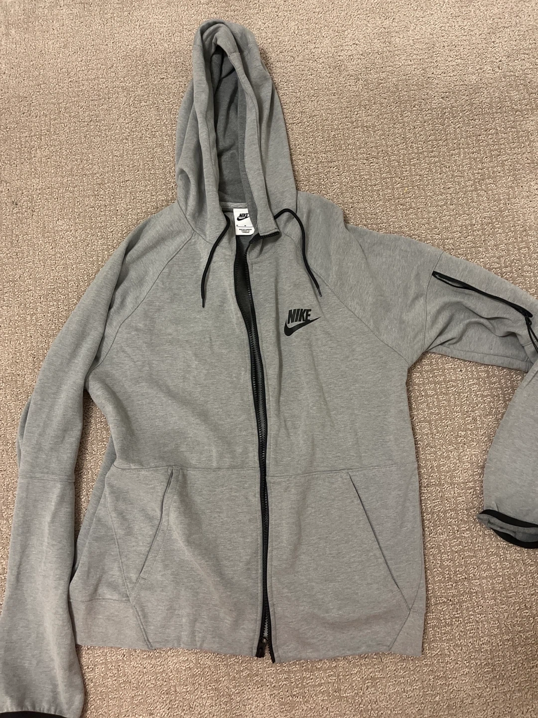 Selling a Nike Tech Fleece full-zip hoodie in grey. It's in great condition and perfect for layering or wearing on its own. The Tech Fleece material is lightweight and warm, making it super comfy for everyday wear