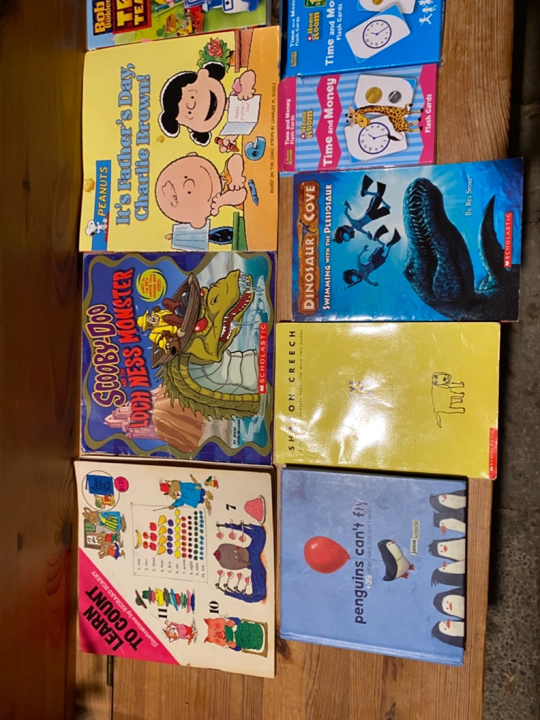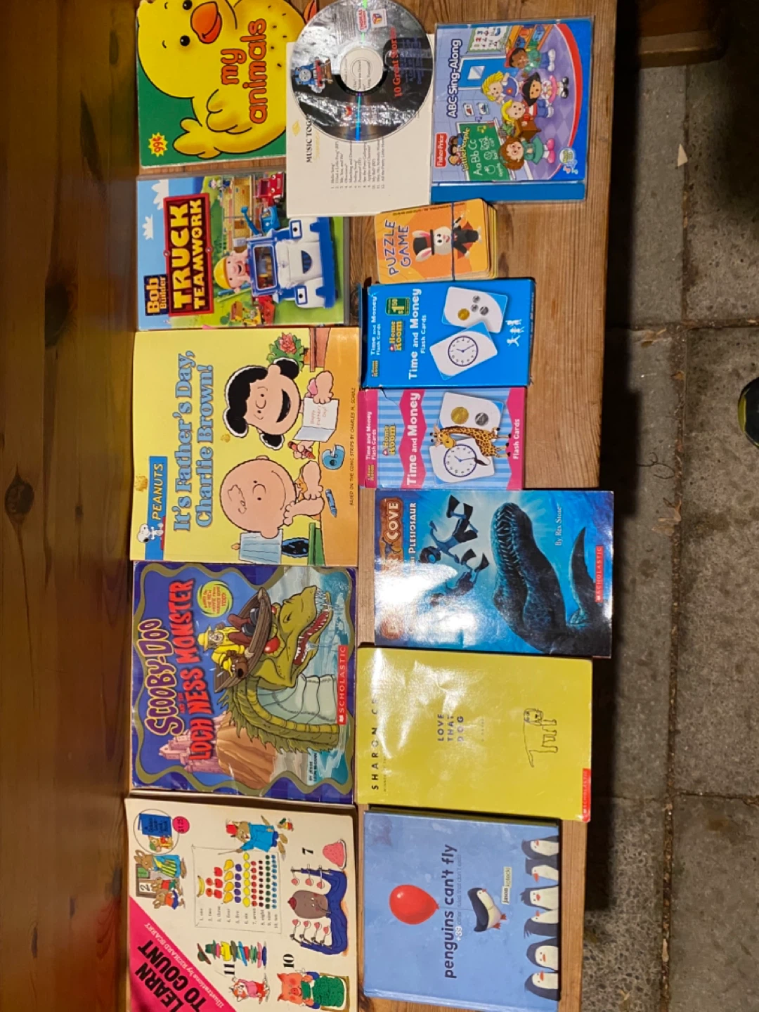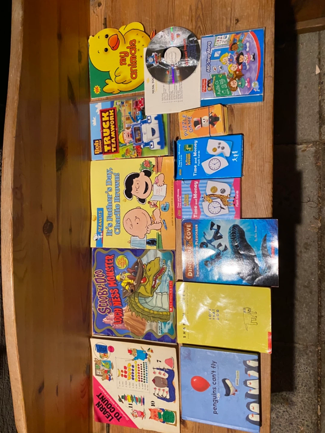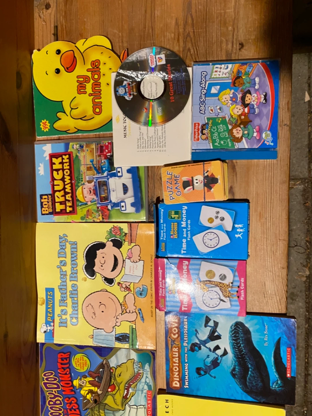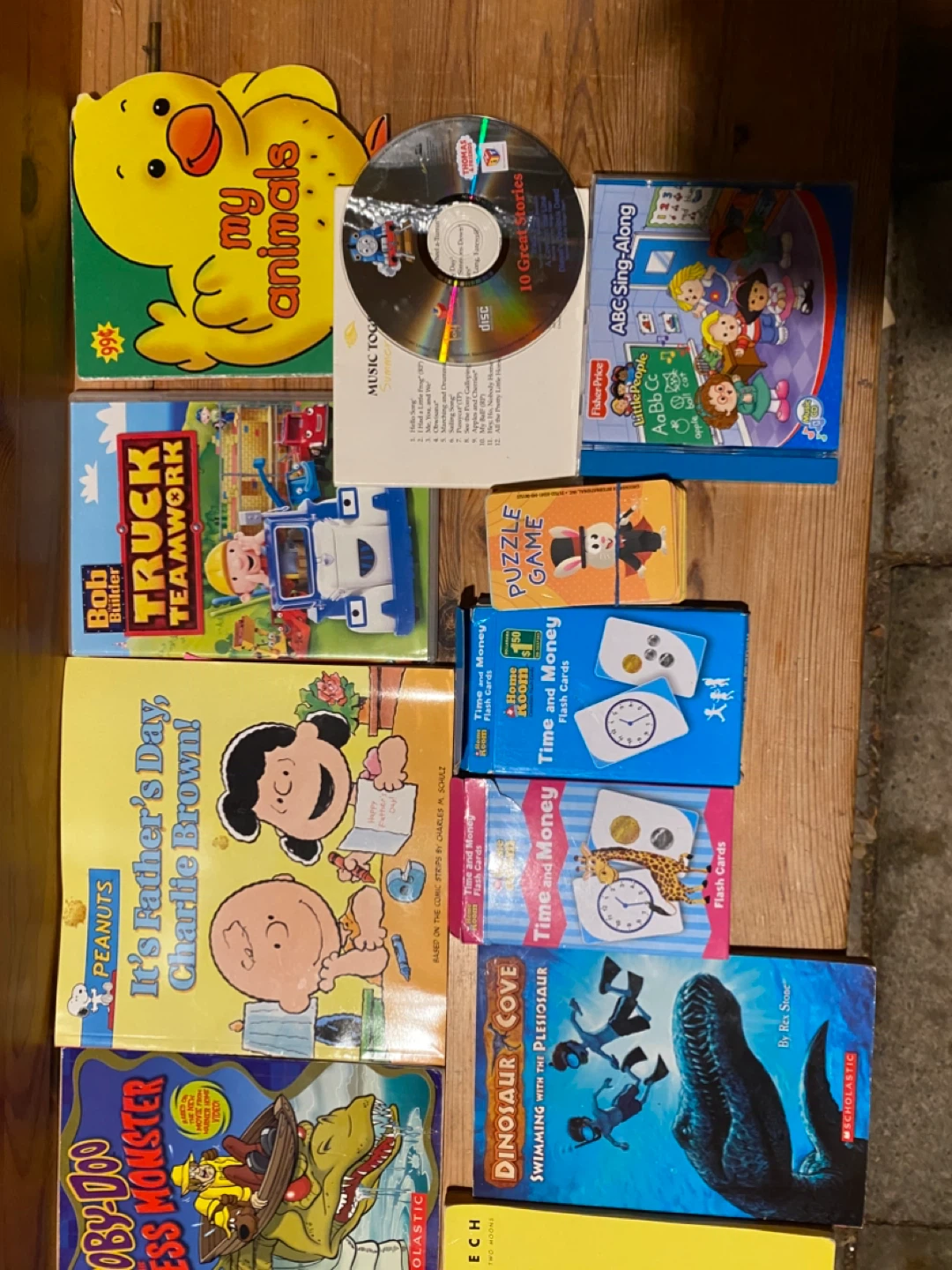 A mixed bundle of children's books and educational flash cards! Includes titles like 'It's Father's Day, Charlie Brown', 'Truck Teamwork', 'Dinosaur Cove', and more. Also includes a Fisher-Price ABC Sing-Along book and Time and Money flash cards. Perfect for early learning and story time!