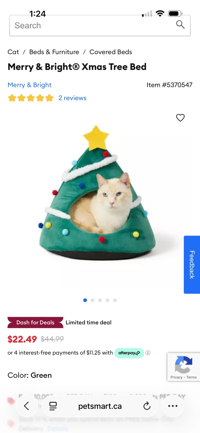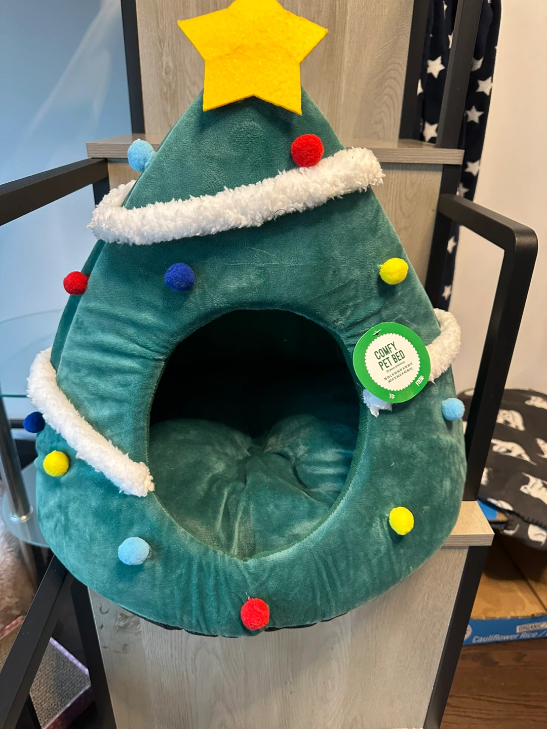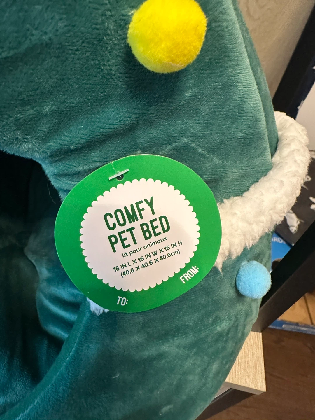 Snuggle up your furry friend in this adorable Merry & Bright Xmas Tree Bed! It's a cozy and festive retreat for your pet. The bed is green and shaped like a Christmas tree, complete with colourful pompom 'ornaments' and a star on top. The size is 16 in L x 16 in W x 16 in H (40.6 cm x 40.6 cm x 40.6 cm). Originally bought for $22.49.