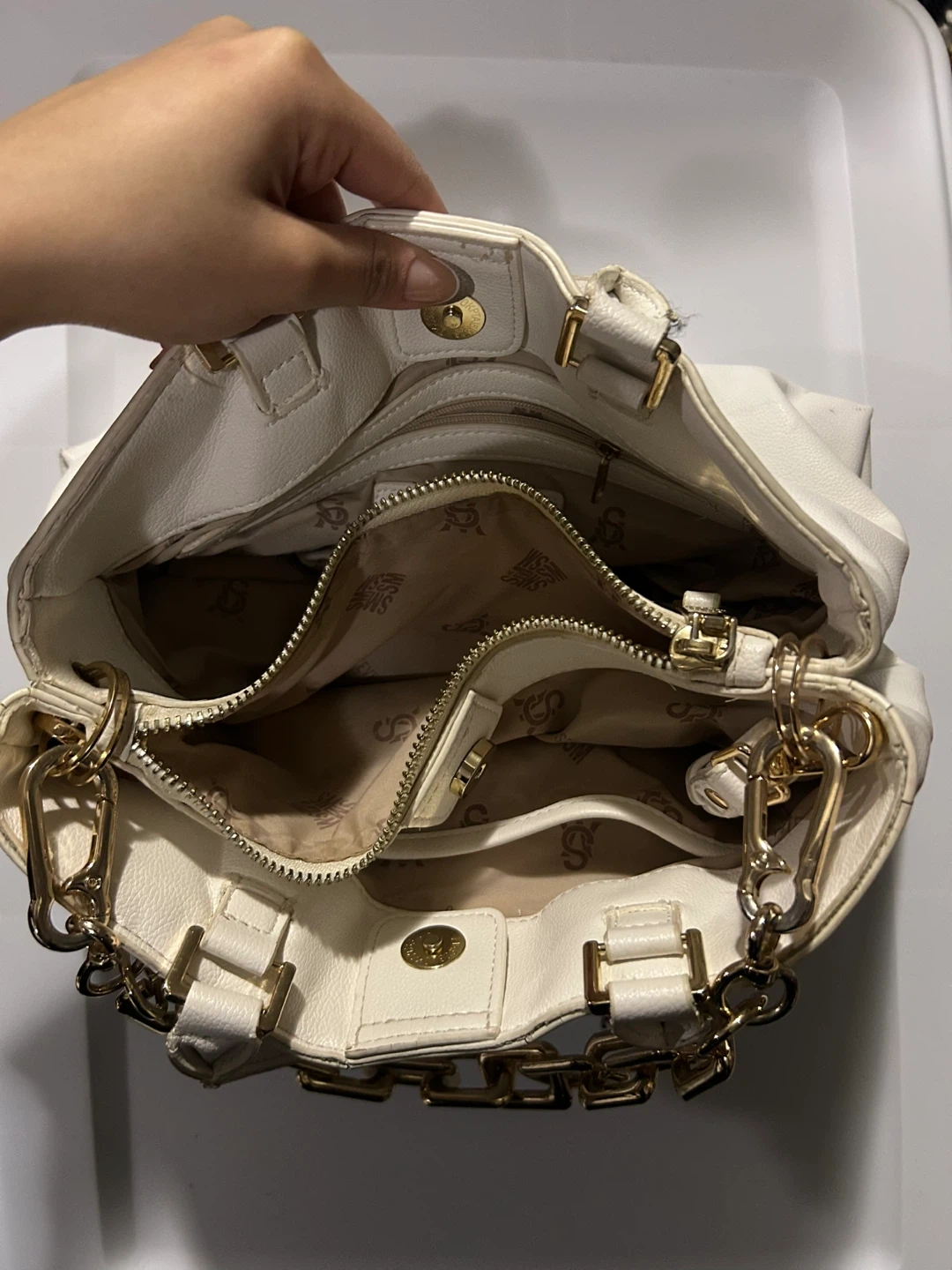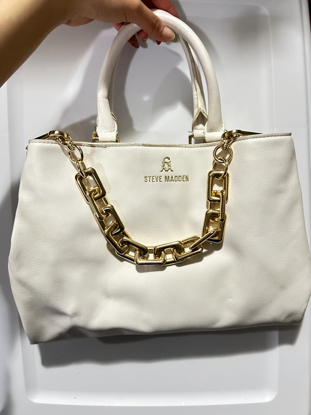 This is a stylish Steve Madden tote bag in white! It features a gold chain detail and is perfect for everyday use. The bag has a zipper closure and multiple compartments inside to keep your belongings organized