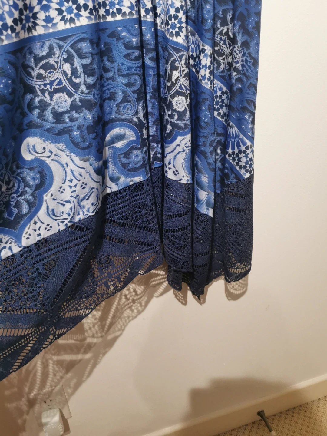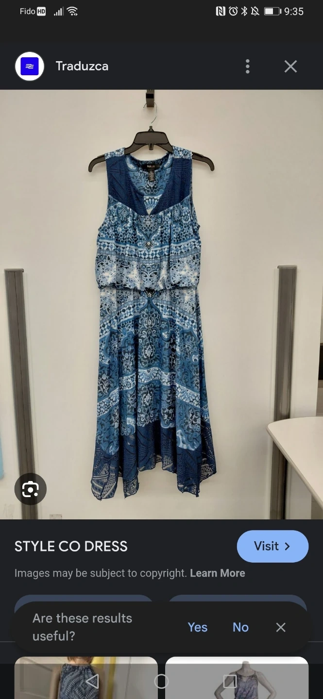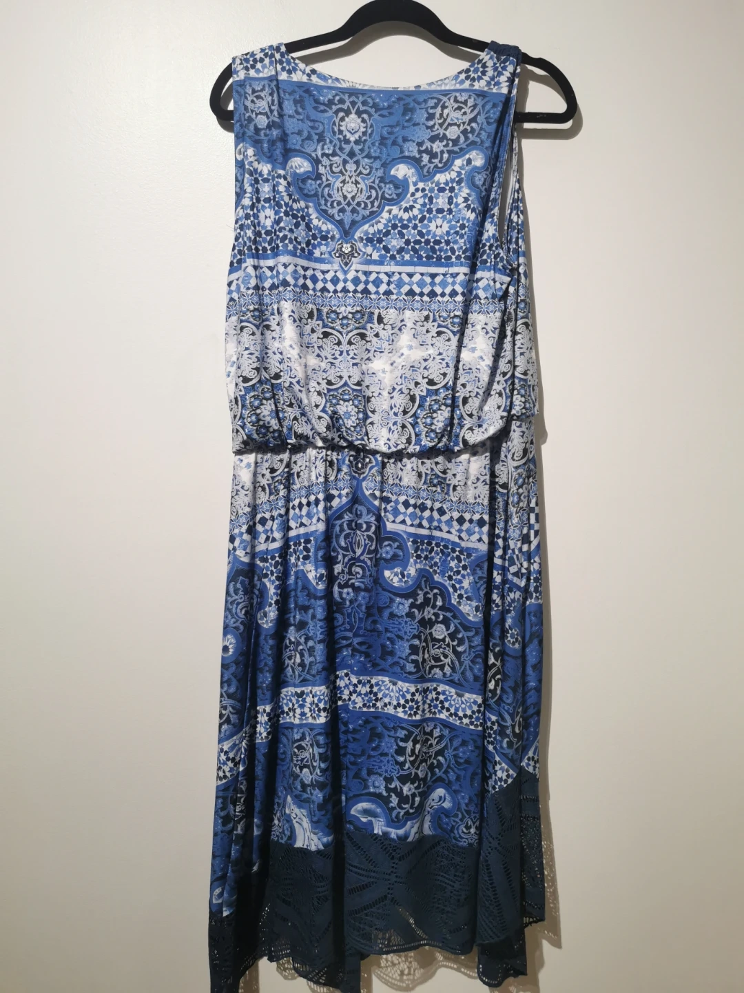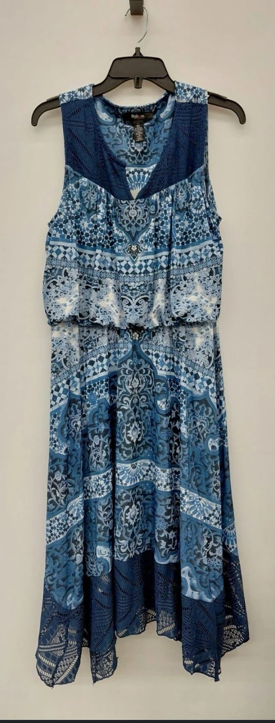 This is a lovely blue and white patterned dress from Style&co. It's a size XL and features a stylish lace trim. The shell is made of 94% polyester and 6% spandex, while the lining/trim is 100% polyester, exclusive of elastic. It's in great condition and ready for a new home!