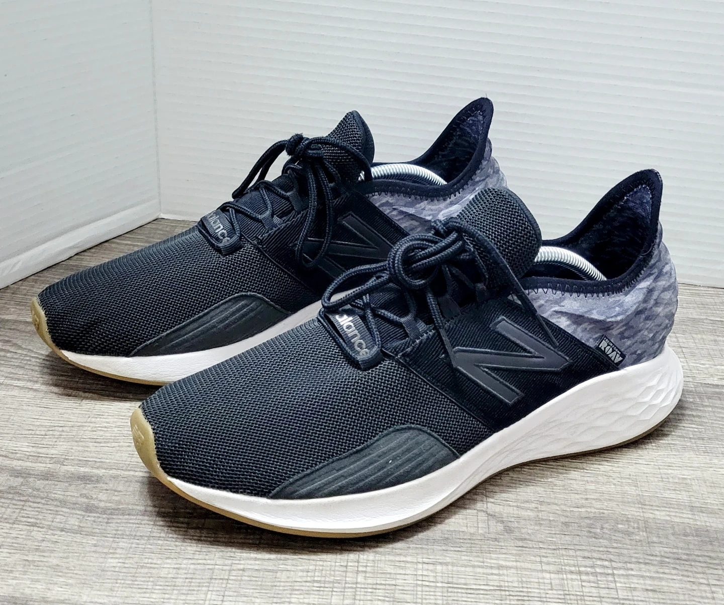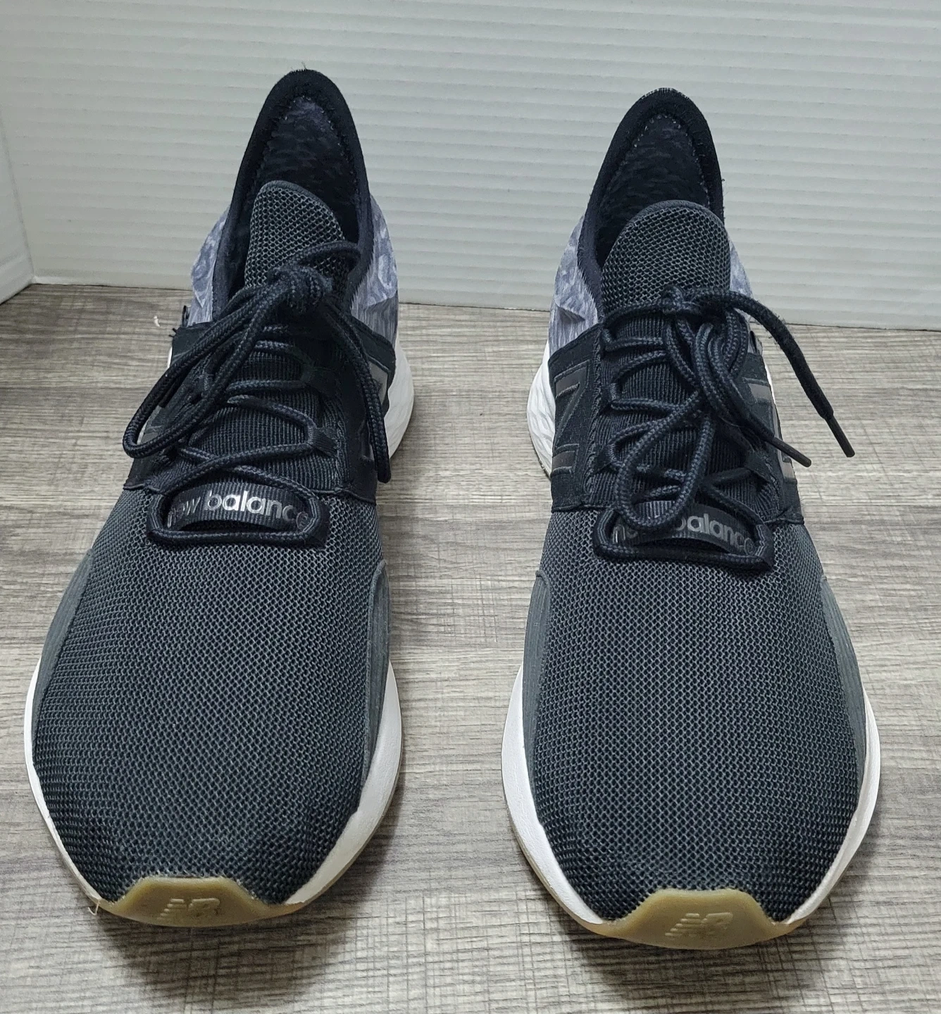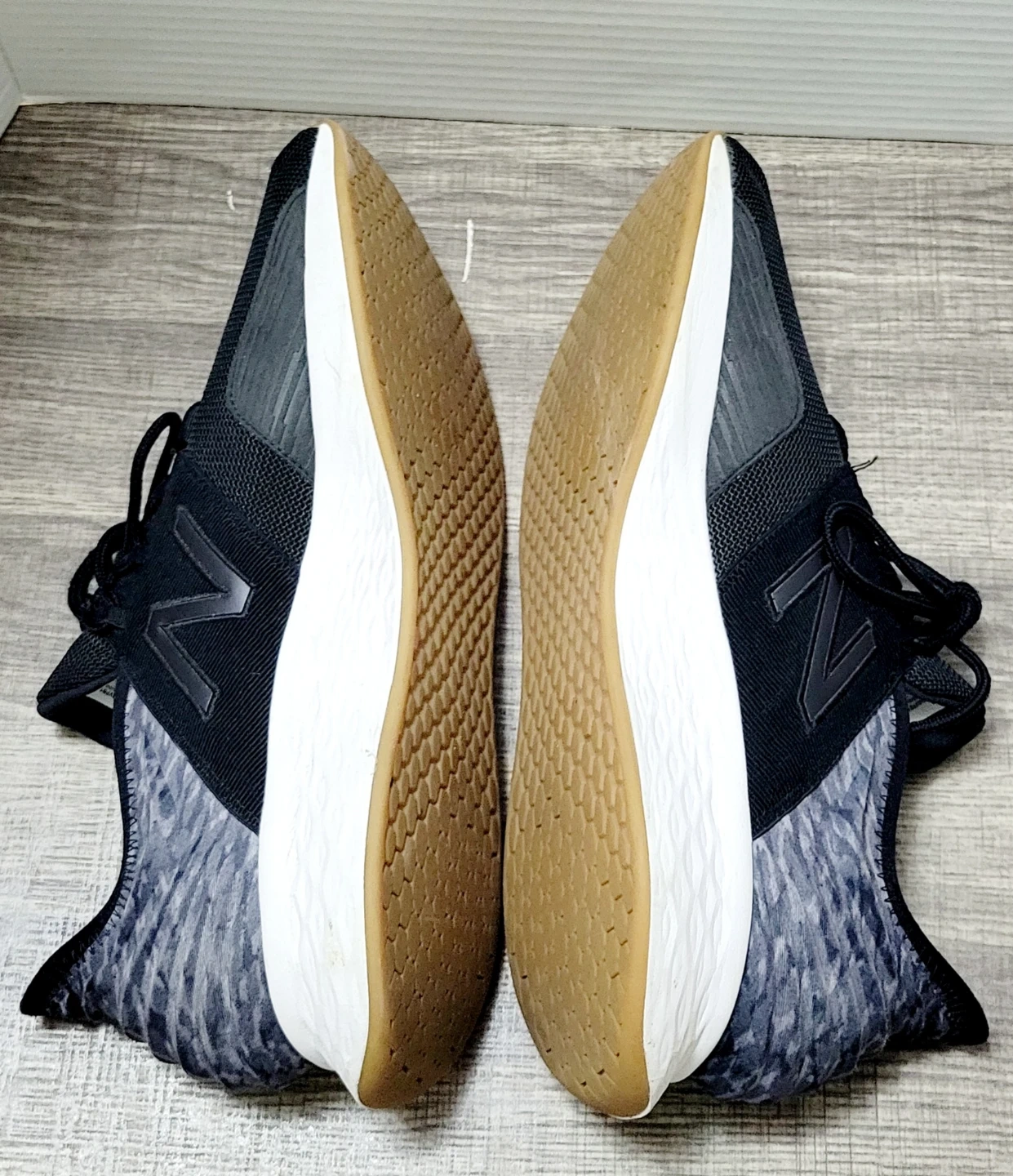 Selling a pair of New Balance Fresh Foam Roav v1 sneakers in US size 12! They are black with a gray accent on the heel. The manufacturing date is 2022 January