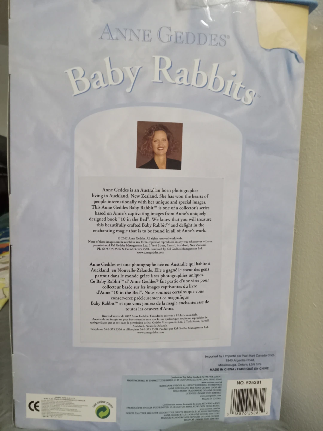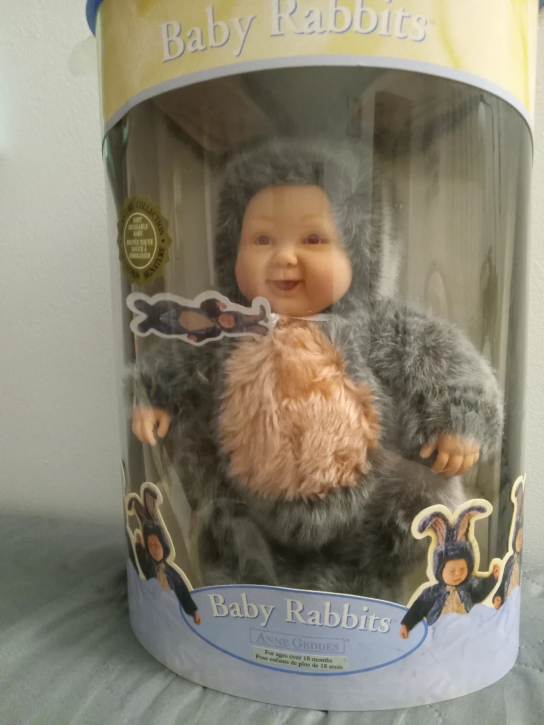 This is an Anne Geddes Baby Rabbits doll. It's from a collector's series based on Anne Geddes' imaginative images. It's designed to look like a baby rabbit. It's suitable for ages over 18 months. The bottom of the box is missing
