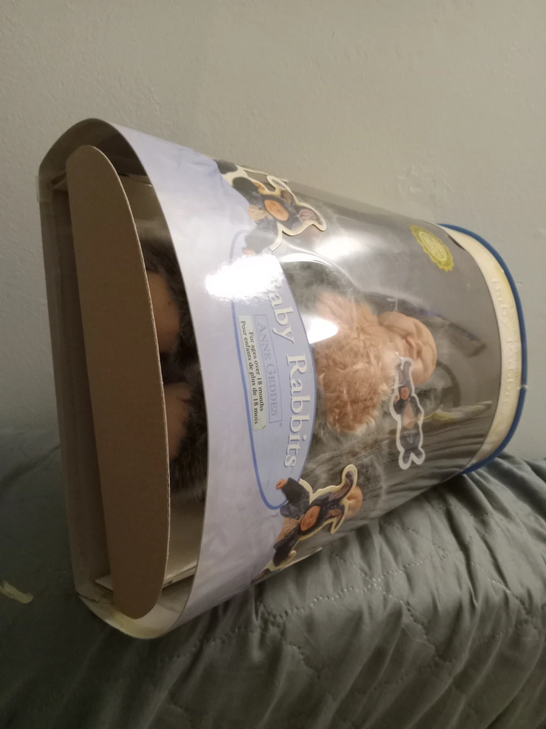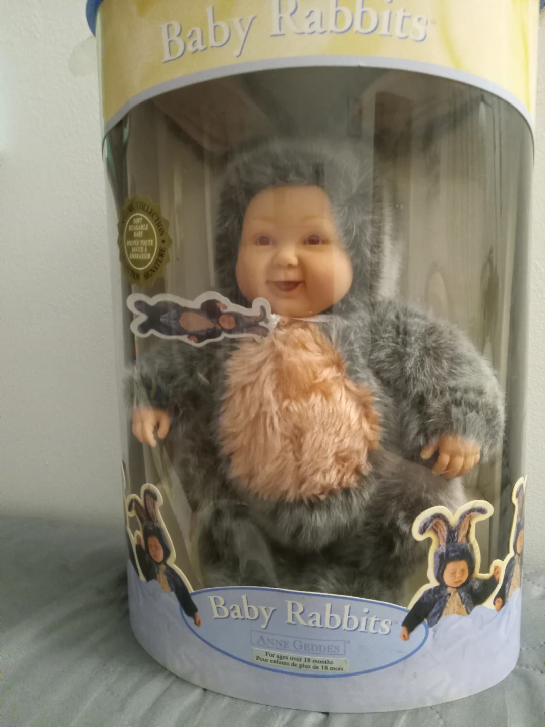 This is an Anne Geddes Baby Rabbits doll. It's from a collector's series based on Anne Geddes' imaginative images. It's designed to look like a baby rabbit. It's suitable for ages over 18 months. The bottom of the box is missing
