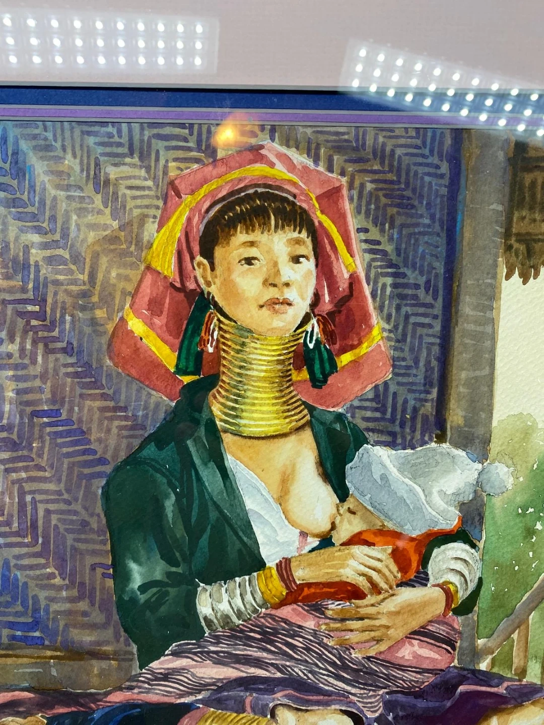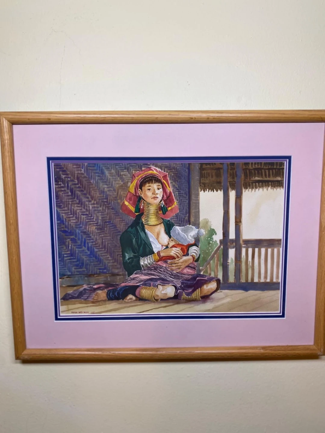 Framed watercolor painting by Khin Mg Win. The painting is of a woman with a child. The frame measures approximately 22 inches by 18 inches.
