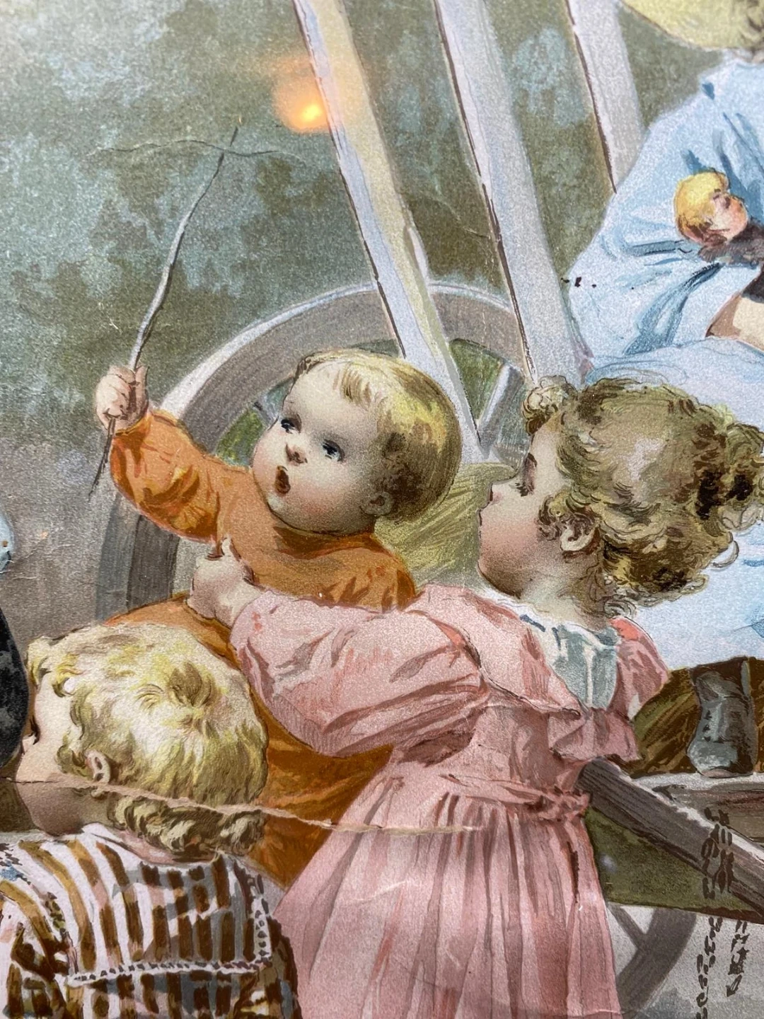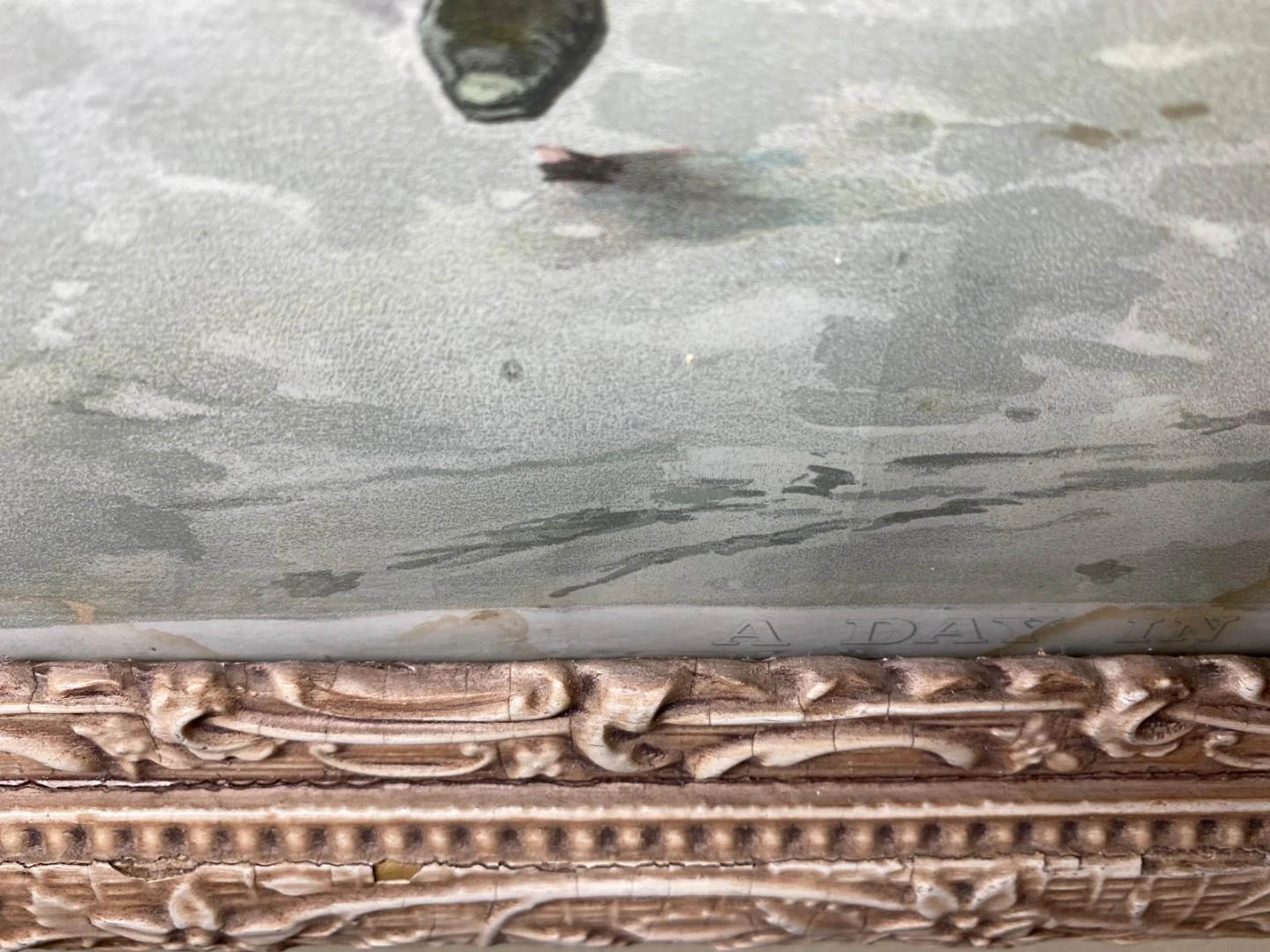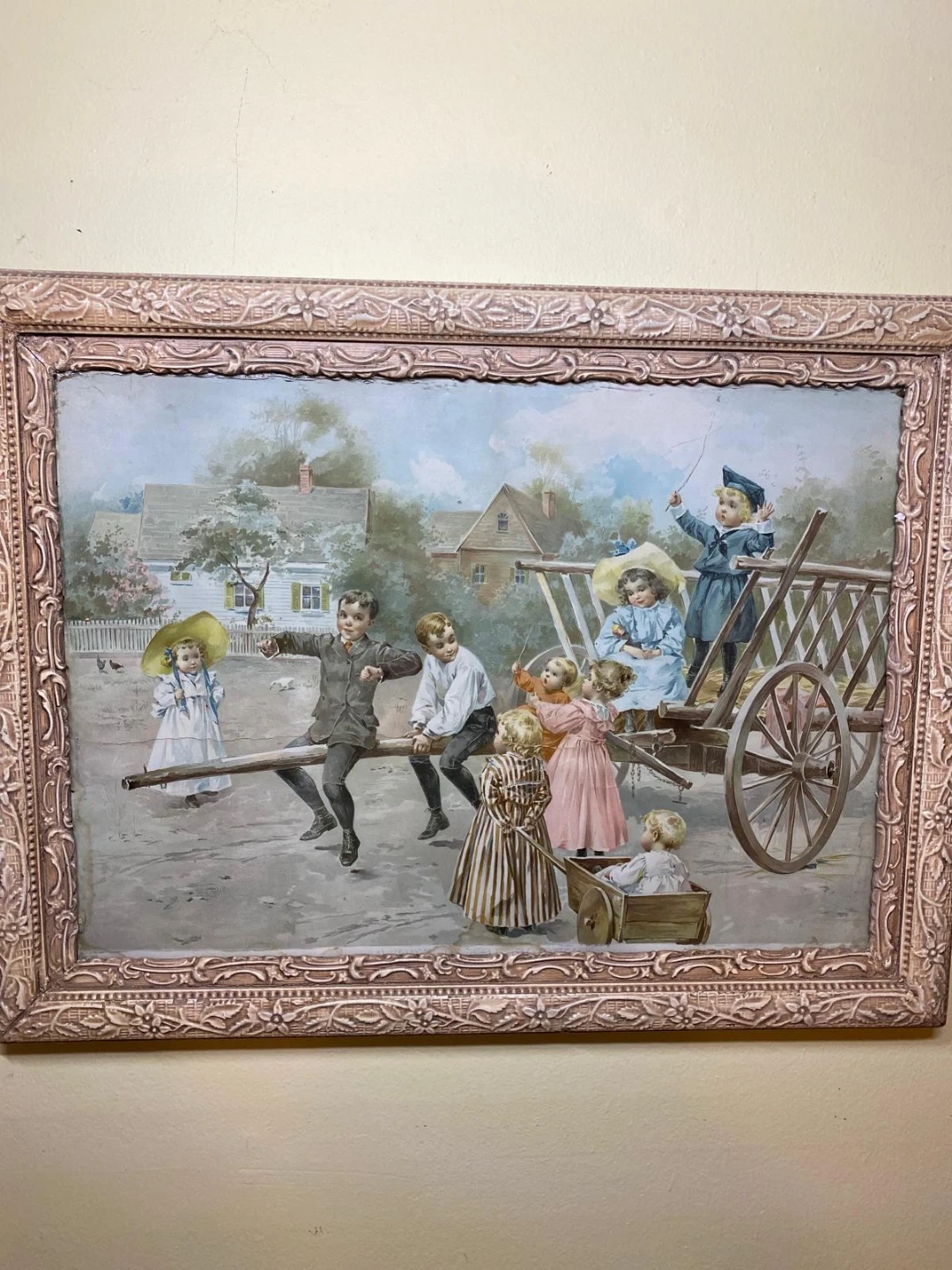 Selling a vintage framed print featuring a charming scene of children playing. The frame has a decorative, ornate design. It is in good condition for its age, with some wear on the frame adding to its vintage character. Perfect for adding a touch of nostalgia to your home decor