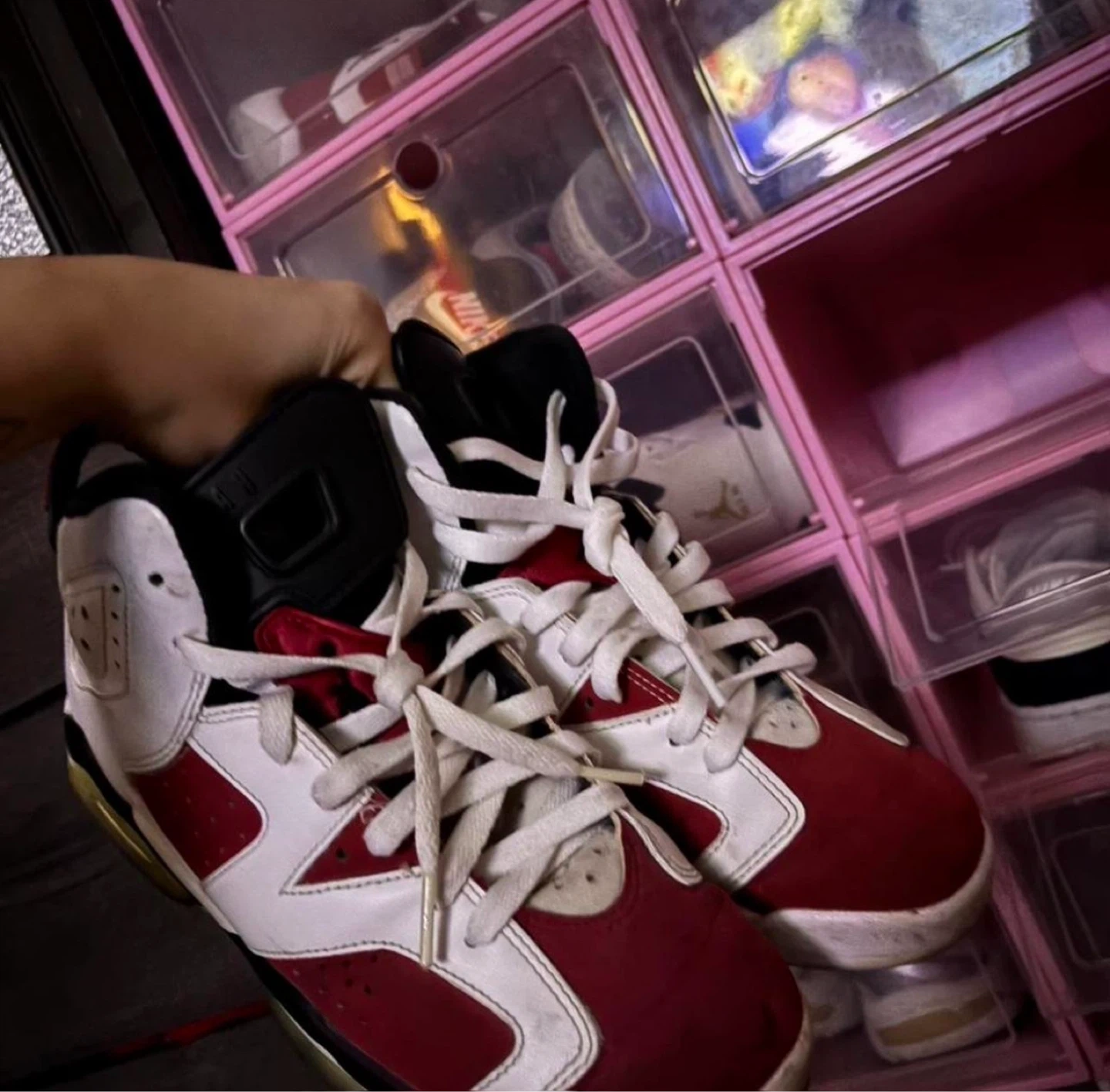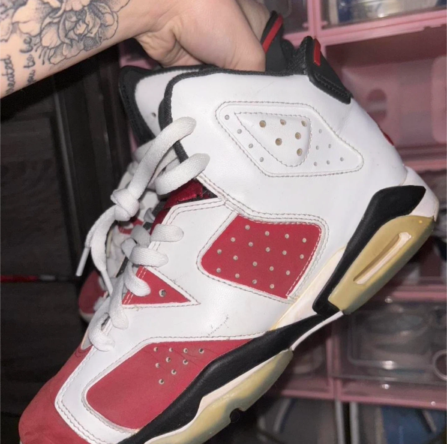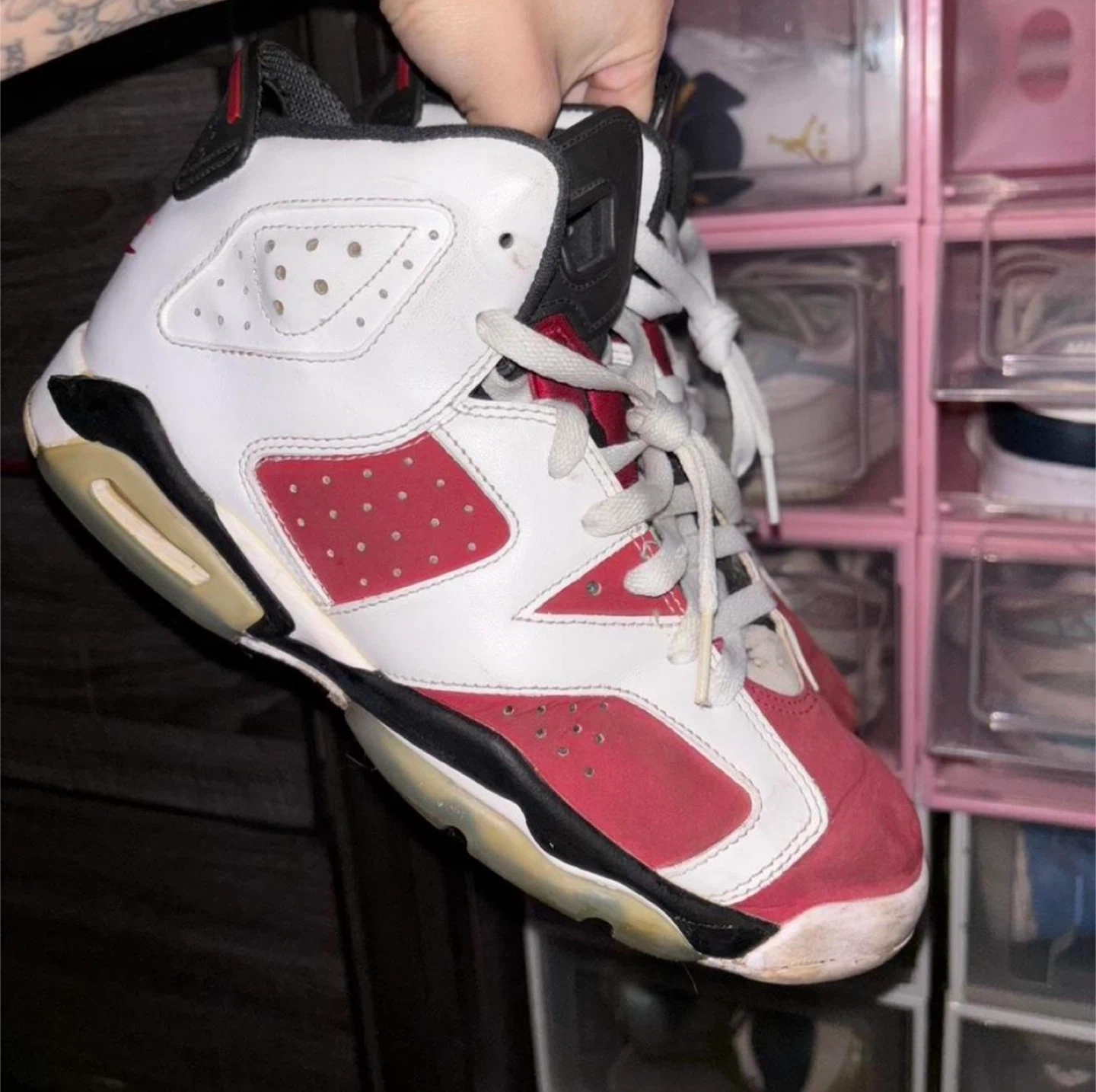 Selling a pair of Jordan 6 Retro Carmine (2021) sneakers! They are in good condition and ready for a new owner. Perfect for everyday wear or for adding to your collection