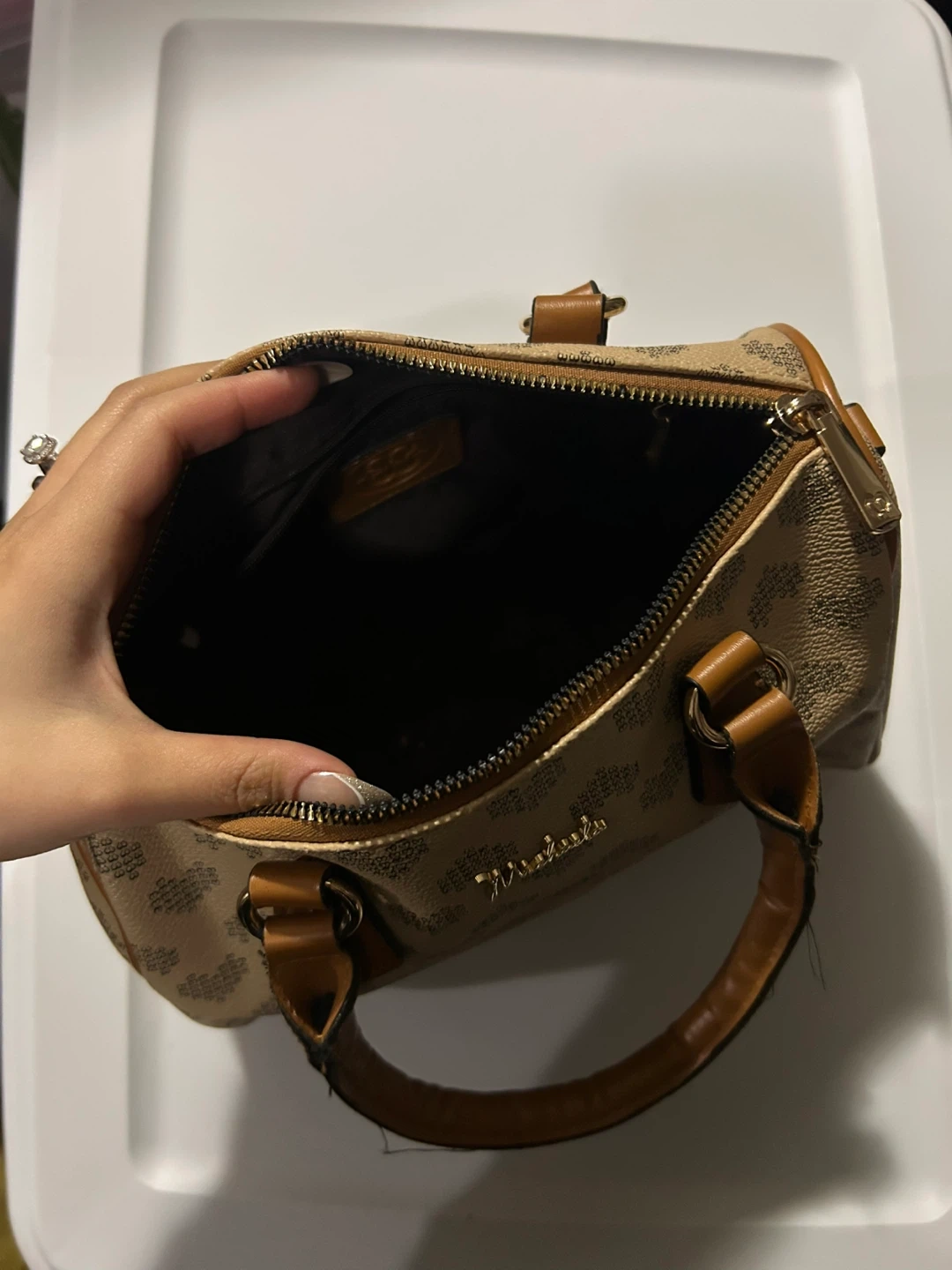 This is a Michaela satchel bag that's perfect for everyday use! It has a cute pattern and is in good condition. It also comes with a strap!