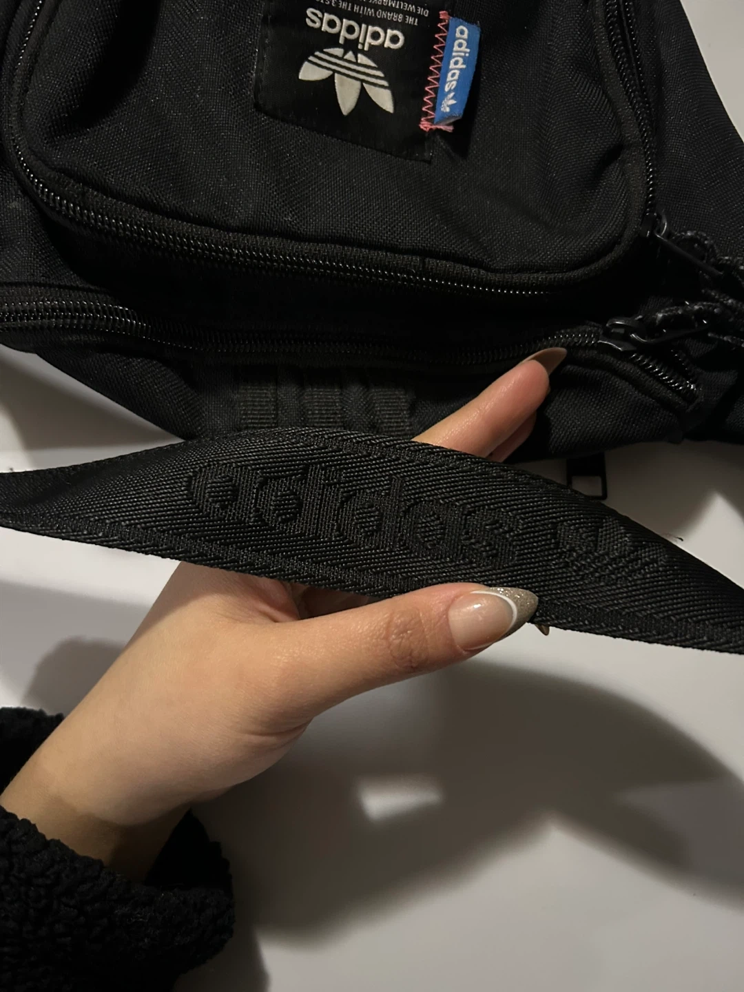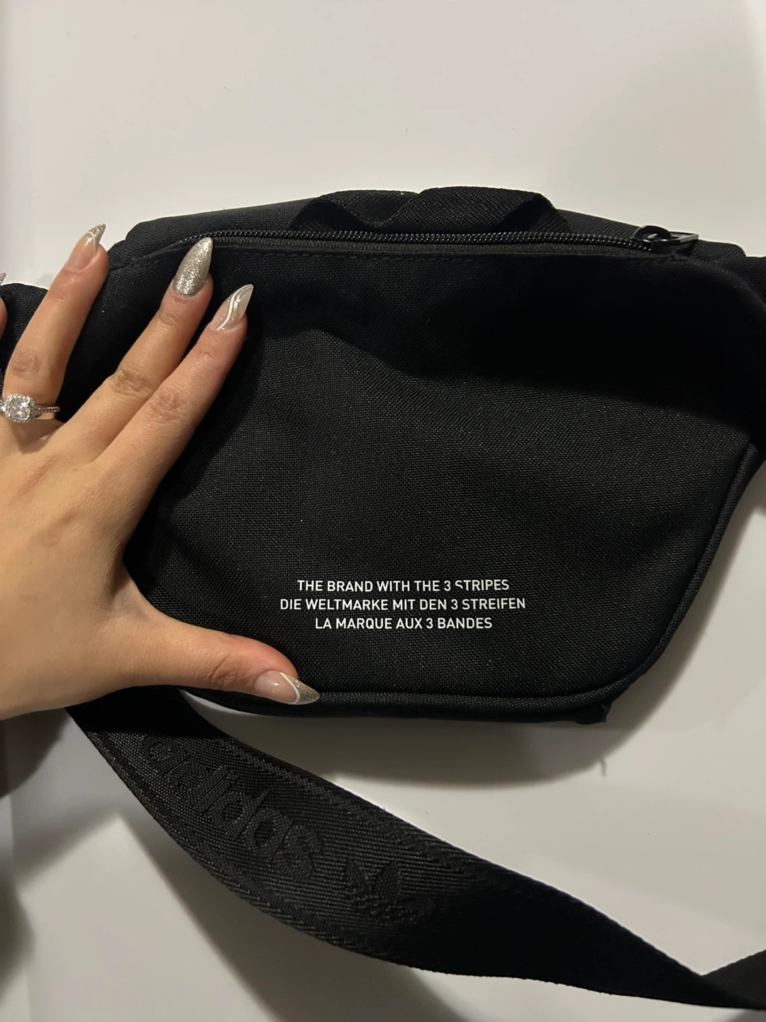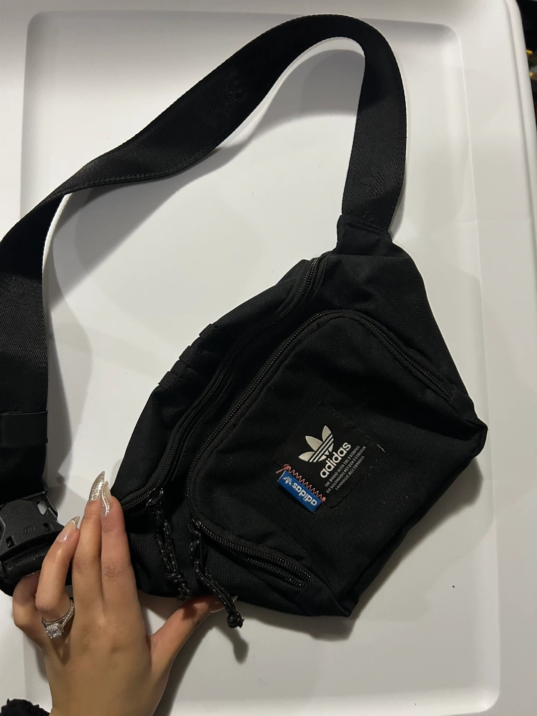 Selling a black Adidas belt bag. It has a main compartment and several smaller pockets with zippers. The strap also has the Adidas logo on it. Great for everyday use or travel!